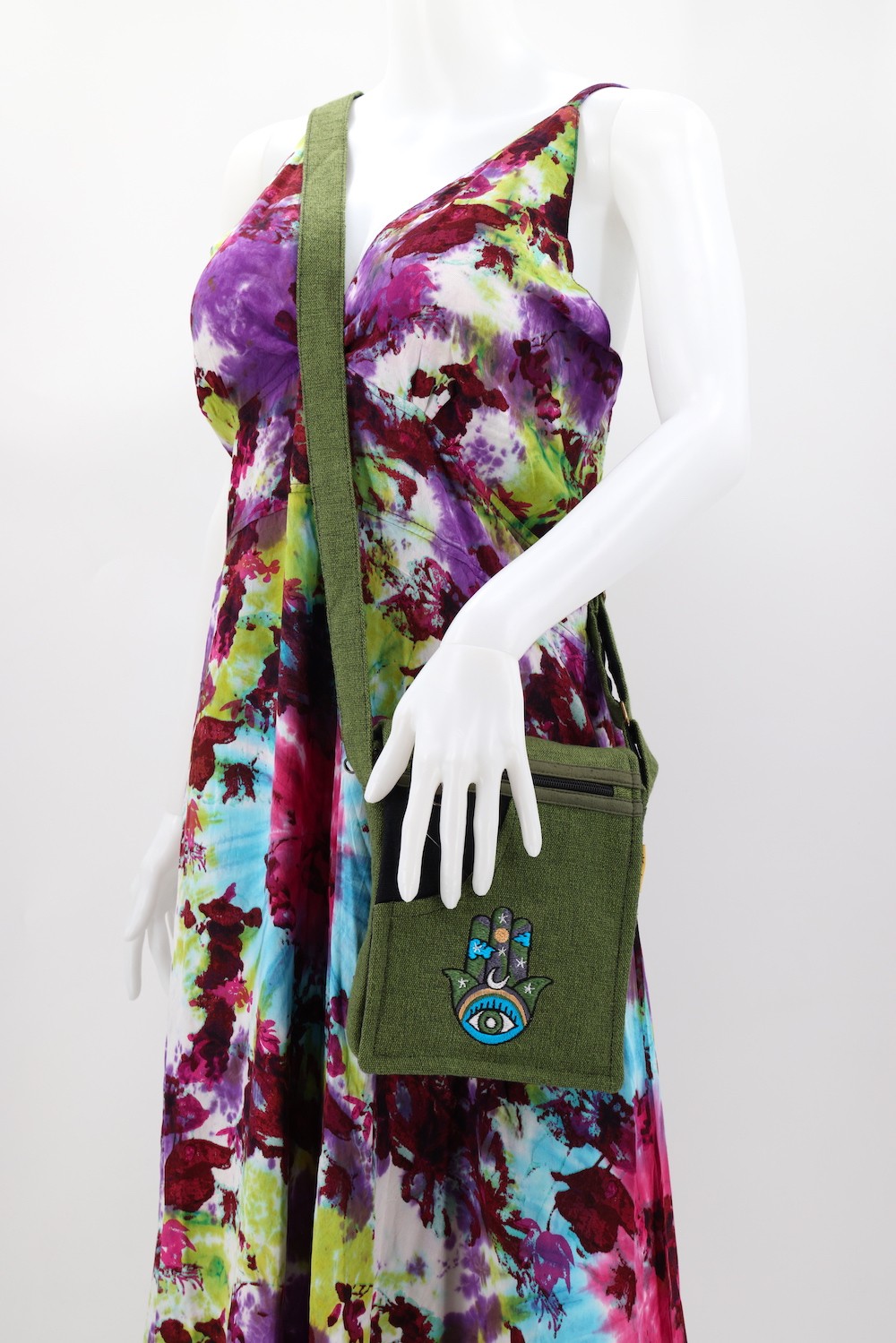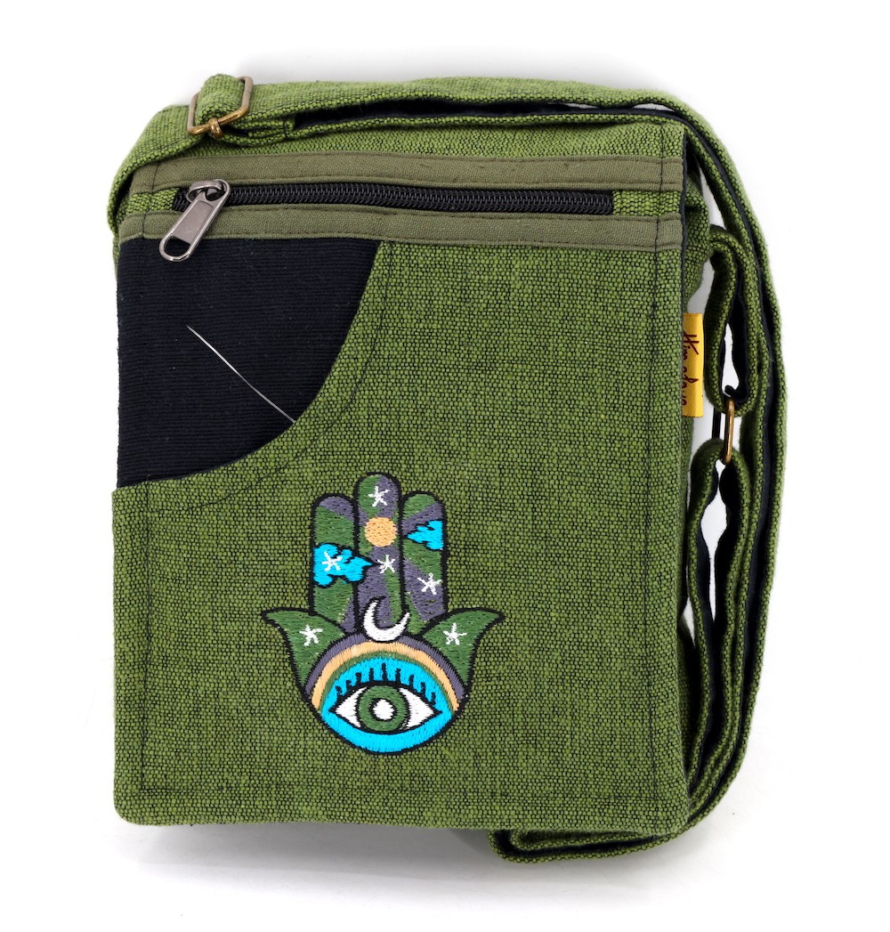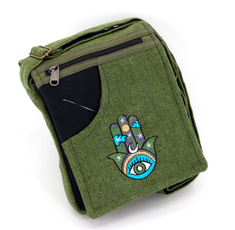 The beautiful Hand-Woven Cotton Travel bag is hand made in Nepal with pure 100% organic Himalaya Cotton. This modern Mushroom Embroidery Cotton passport bag is supremely versatile and fashionable. This bag features are it has two compartments with zippers and it has adjustable strap with outside two pockets in the front and in the main pocket above with a zipper. It is a fair trade made product.