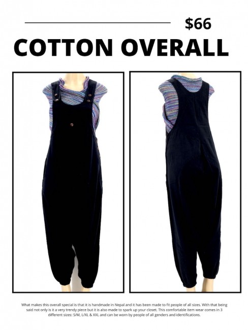 What makes this overall special is that it is handmade in Nepal and it has been made to fit people of all sizes. With that being said not only is it a very trendy piece but it is also made to spark up your closet. This comfortable item wear comes in 3 different sizes: S/M, L/XL & XXL and can be worn by people of all genders and identifications.