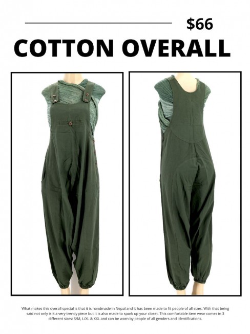 What makes this overall special is that it is handmade in Nepal and it has been made to fit people of all sizes. With that being said not only is it a very trendy piece but it is also made to spark up your closet. This comfortable item wear comes in 3 different sizes: S/M, L/XL & XXL and can be worn by people of all genders and identifications.