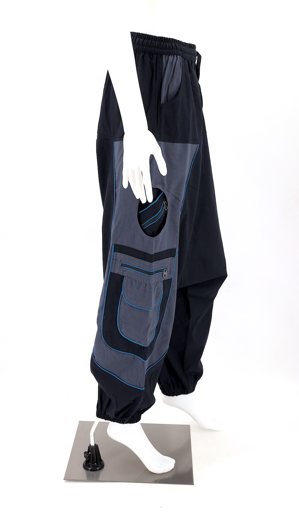 These pants come with an adjustable waist that can be easily tailored to your needs, depending on the size you are wearing. Each side boasts three pockets, featuring a larger pocket with a secure zipper to keep your items and valuables safe, as well as a smaller buttoned pocket for added convenience, in addition to smaller pockets in the hips. There is also a zippered pocket on the left hand side. Additionally, the elasticated ankles provide a comfortable fit.