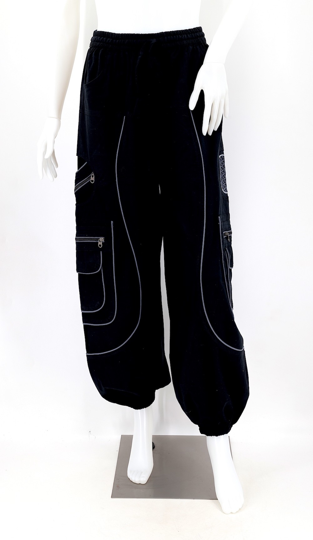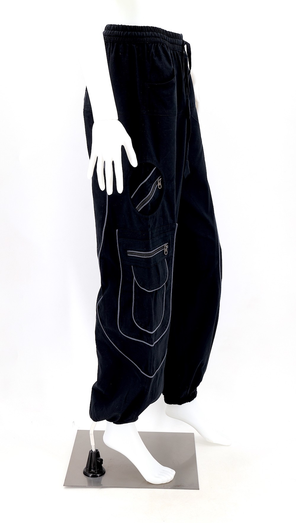 These pants come with an adjustable waist that can be easily tailored to your needs, depending on the size you are wearing. Each side boasts three pockets, featuring a larger pocket with a secure zipper to keep your items and valuables safe, as well as a smaller buttoned pocket for added convenience, in addition to smaller pockets in the hips. There is also a zippered pocket on the left hand side. Additionally, the elasticated ankles provide a comfortable fit.