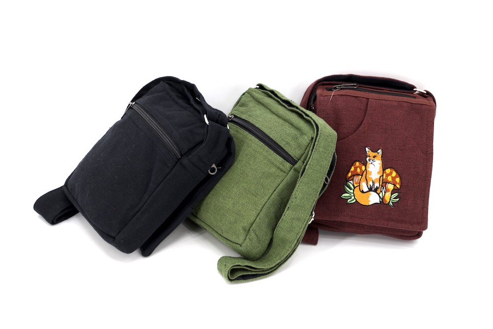 The beautiful Hand-Woven Cotton Travel bag is hand made in Nepal with pure 100% organic Himalaya Cotton. This modern Mushroom Embroidery Cotton passport bag is supremely versatile and fashionable. This bag features are it has two compartments with zippers and it has adjustable strap with outside two pockets in the front and in the main pocket above with a zipper. It is a fair trade made product.