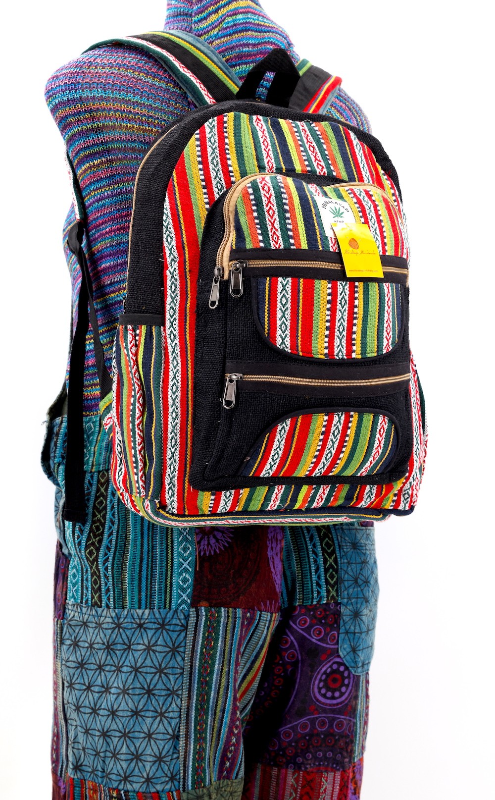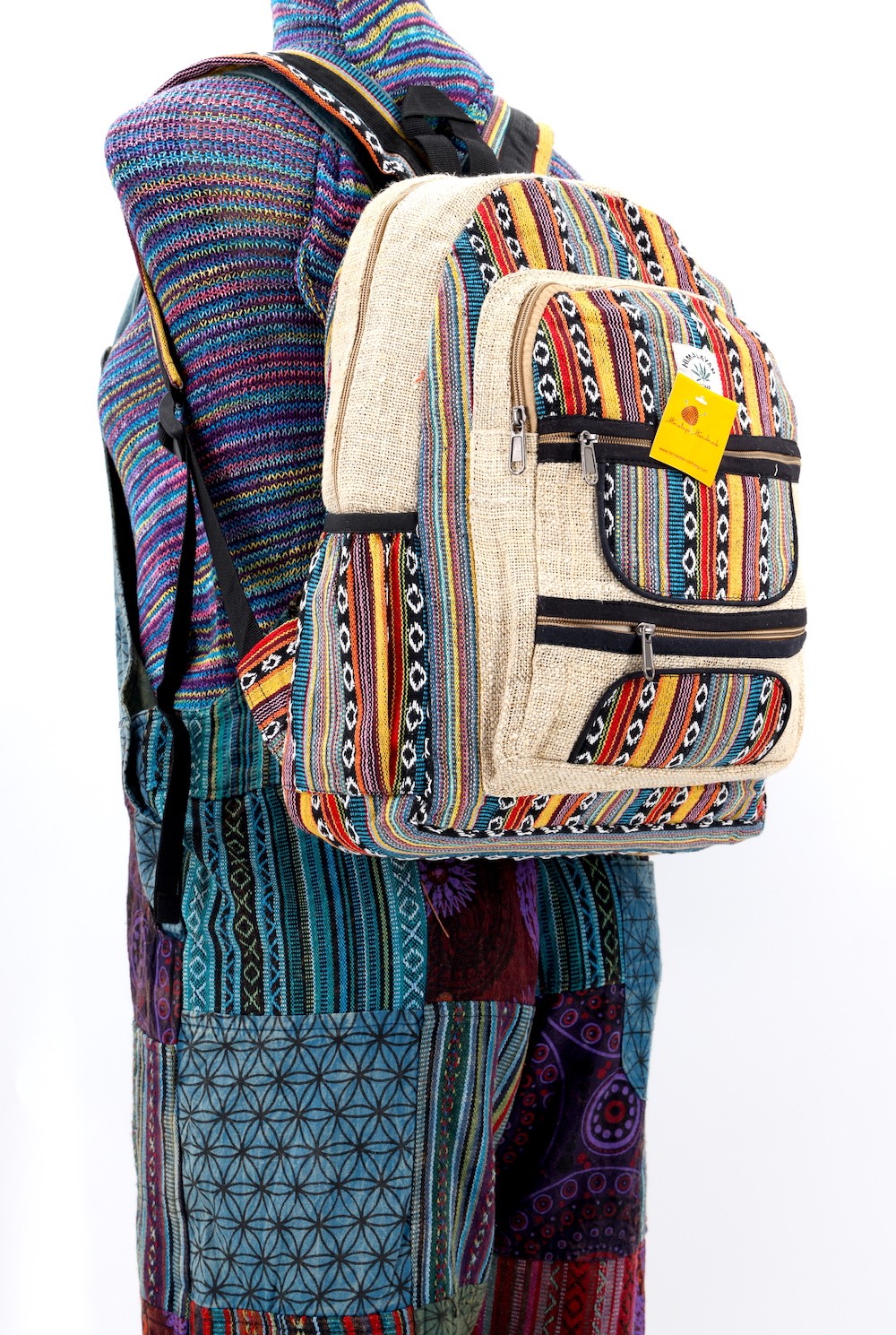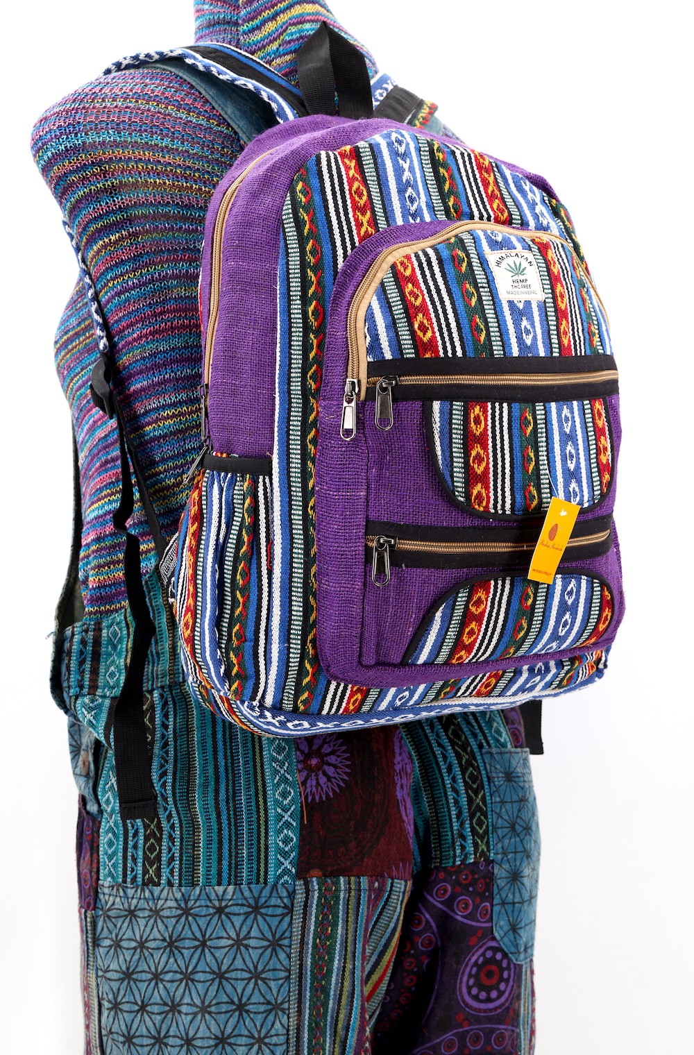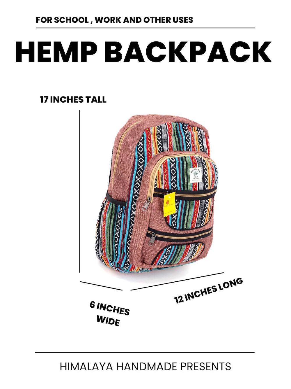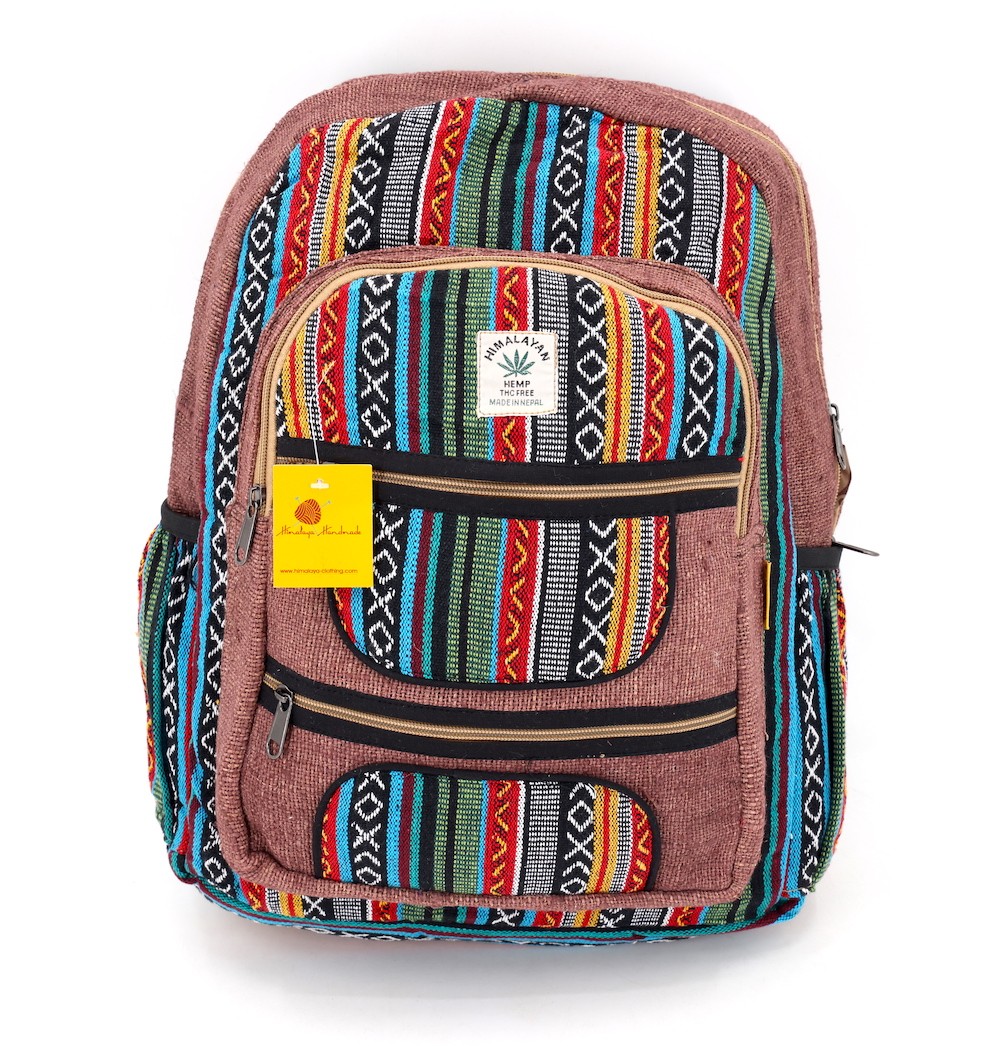 At Himalaya Handmade we are known for creating the modern hemp backpacks that are now available in profusion of design and colors. Our Mini backpack with multicolor Aztec pattern is made from eco-friendly natural hand-woven hemp and cotton fabric and it is beautifully handcrafted in Nepal, they are high quality and this backpack has everything you need. You will not find higher quality anywhere else. All of our bags are sourced from the mountainous regions of Nepal and are all 100% Handmade. This backpack features are it has a unique multi colored pocket. Handcrafted this Backpack Includes, laptop compartment – fits any type and size, 4 separate zippered compartments with 2 pockets, 2 water bottle holders, extremely strong construction, strong original two metal zippers on main compartment, soft padded straps and made from 100% Hemp, the entire bag is extremely strong but also breathable. Color of these bag will not be exact because arrangement of the pattern and these bags are handmade so in color can be slightly different. Pictures color are just example. Every bag is handmade and therefore unique.