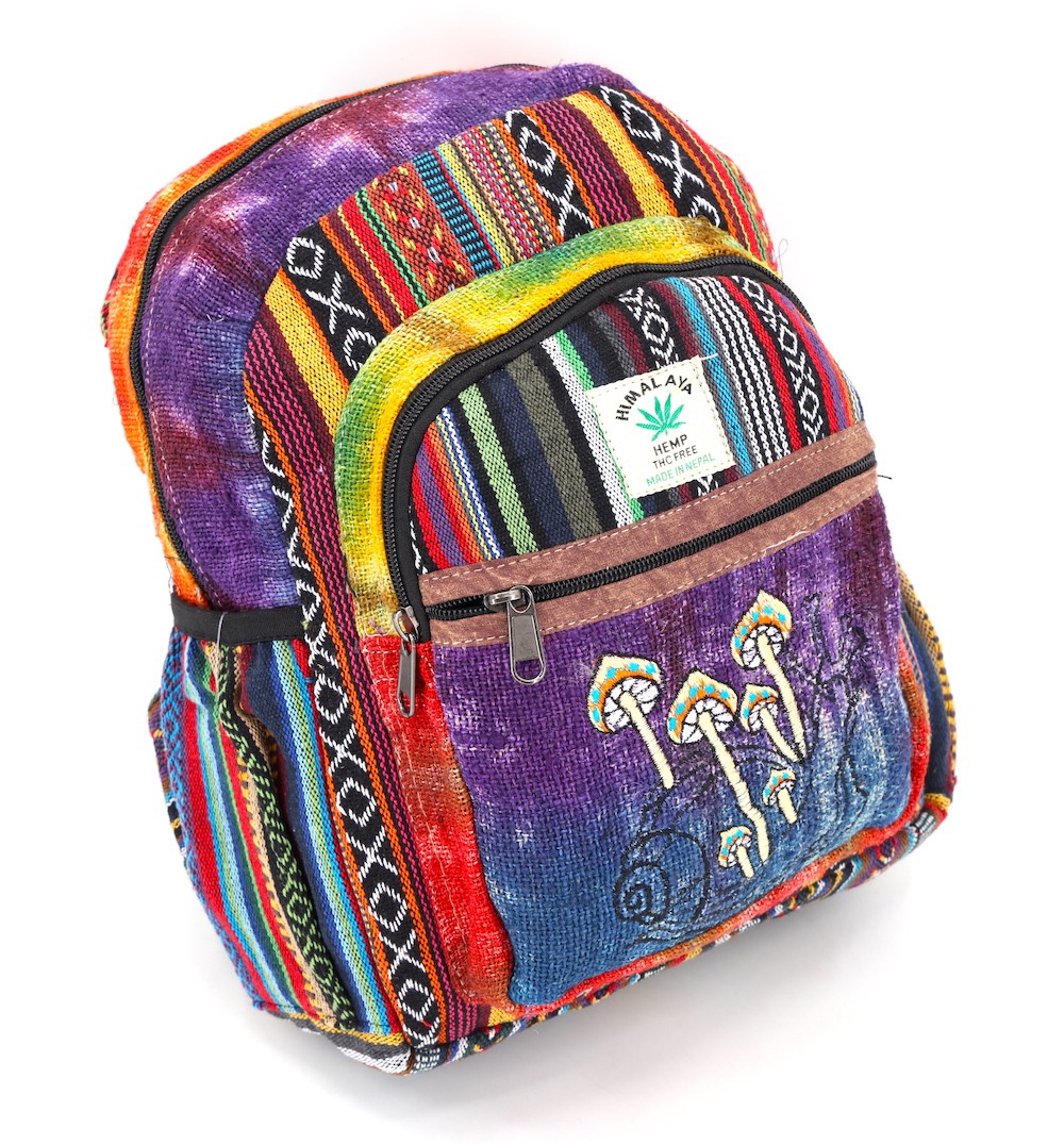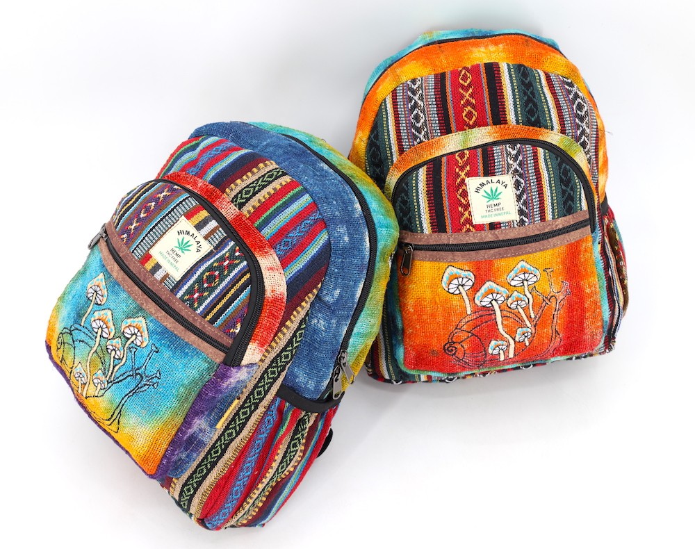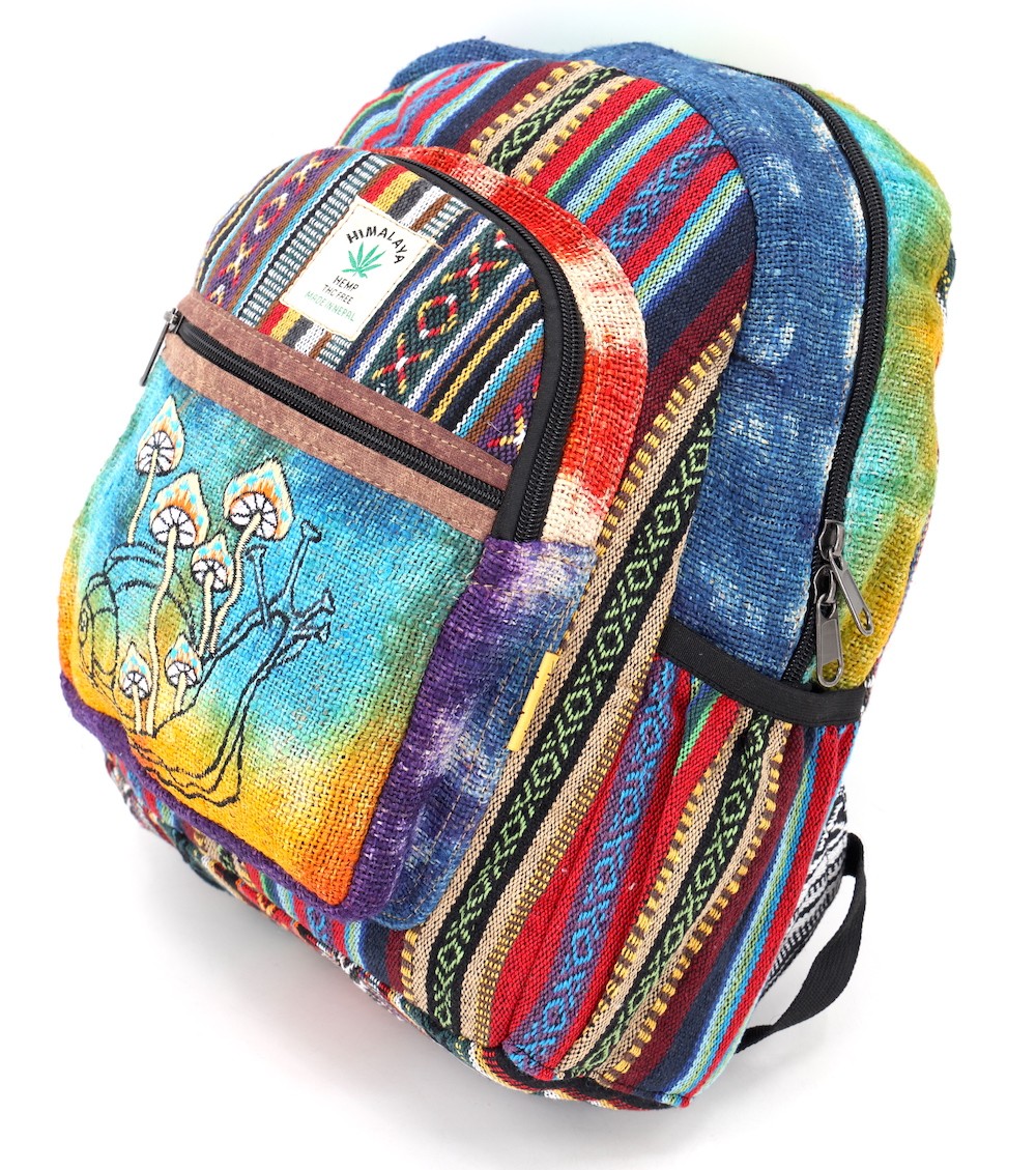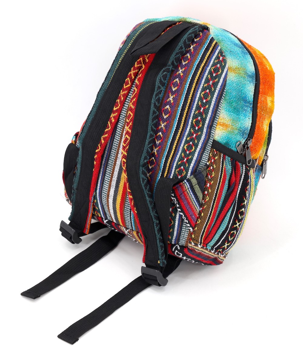 - At Himalaya Handmade we are known for creating the modern Mini hemp backpacks that are now available in a vast array of design and colors. Our Mini backpack with multicolor Aztec pattern which is made from eco-friendly natural hand-woven hemp and cotton fabric which is beautifully handcrafted in Nepal, they are of high quality and our backpacks have everything that you will need. You will not find products of higher quality anywhere else. All of our bags are sourced from the mountainous regions of Nepal and are all 100% Handmade. This backpack features are it has a unique multi colored pocket. Handcrafted this uniquely versatile Backpack comes with 2 pockets on the front both zippered and secured with a Velcro, the larger front pocket also has a zippered anti-theft pocket as well as compartment that can be used to store objects as large as 12 inches, There is also a secret back pocket which is zippered and can be used to contains various items, the bag also comes equipped with 2 water bottle holders. The bag has extremely strong construction, it has strong original two metal zippers on main compartment, soft padded straps and made from 100% Hemp, the entire bag is extremely strong but also breathable. Color of these bag will not be exact because arrangement of the pattern and the nature of these bags being handmade can cause the colors and patterns to be slightly different. Images for this bag are an overall example to what the bag looks like. Every bag is handmade and therefore unique.