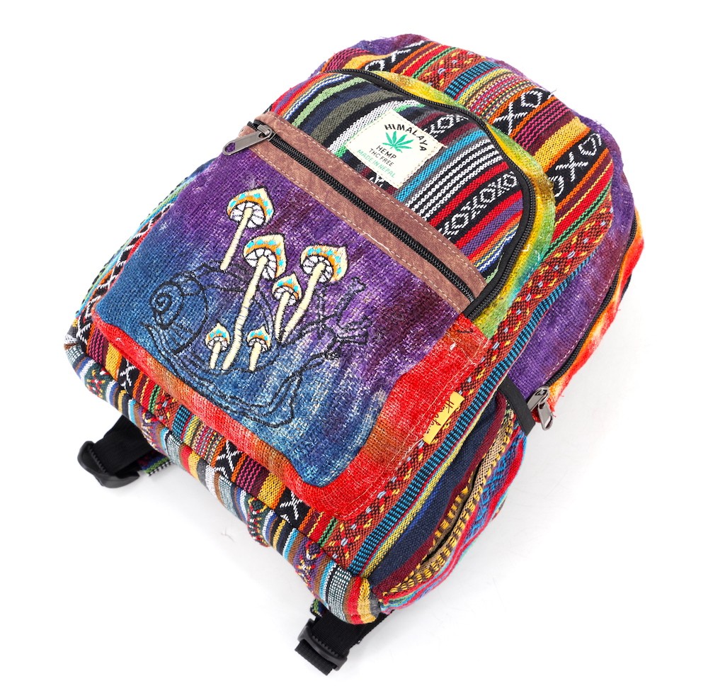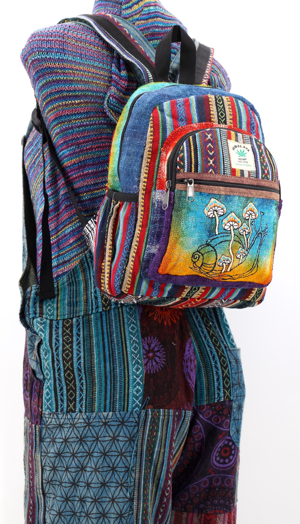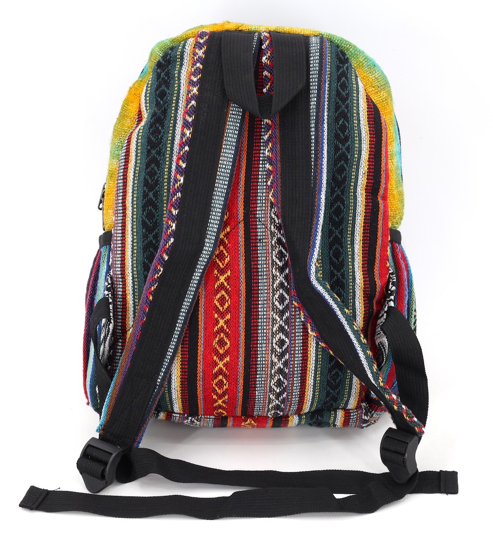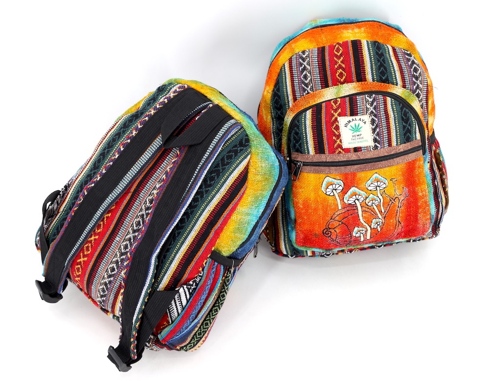 - At Himalaya Handmade we are known for creating the modern Mini hemp backpacks that are now available in a vast array of design and colors. Our Mini backpack with multicolor Aztec pattern which is made from eco-friendly natural hand-woven hemp and cotton fabric which is beautifully handcrafted in Nepal, they are of high quality and our backpacks have everything that you will need. You will not find products of higher quality anywhere else. All of our bags are sourced from the mountainous regions of Nepal and are all 100% Handmade. This backpack features are it has a unique multi colored pocket. Handcrafted this uniquely versatile Backpack comes with 2 pockets on the front both zippered and secured with a Velcro, the larger front pocket also has a zippered anti-theft pocket as well as compartment that can be used to store objects as large as 12 inches, There is also a secret back pocket which is zippered and can be used to contains various items, the bag also comes equipped with 2 water bottle holders. The bag has extremely strong construction, it has strong original two metal zippers on main compartment, soft padded straps and made from 100% Hemp, the entire bag is extremely strong but also breathable. Color of these bag will not be exact because arrangement of the pattern and the nature of these bags being handmade can cause the colors and patterns to be slightly different. Images for this bag are an overall example to what the bag looks like. Every bag is handmade and therefore unique.
