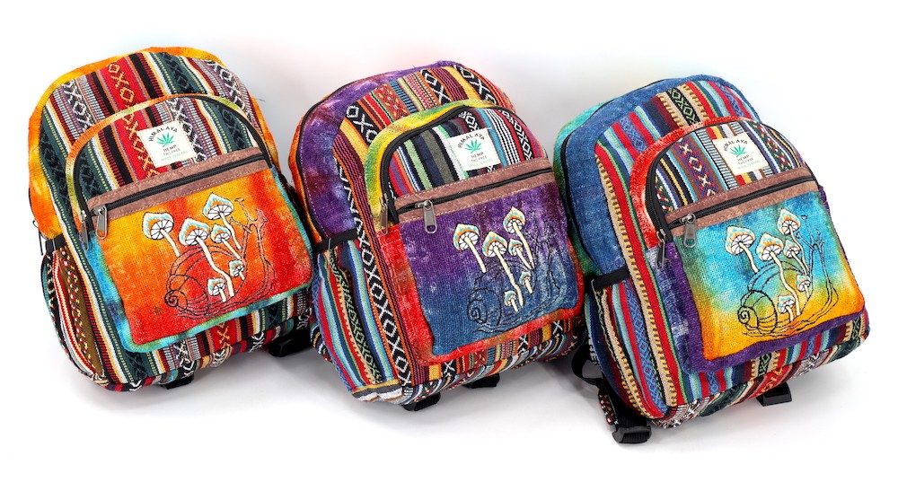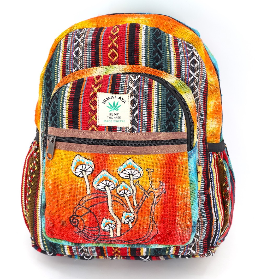 A versatile and beautiful Tie Dye Snail Mushroom Hand Embroidery Hemp Backpack made by 100% Natural THC Free Himalaya Hemp Fabric stitched by talented artisans in Himalaya Range of Nepal. Support underprivileged Nepalese communities with your purchase.
