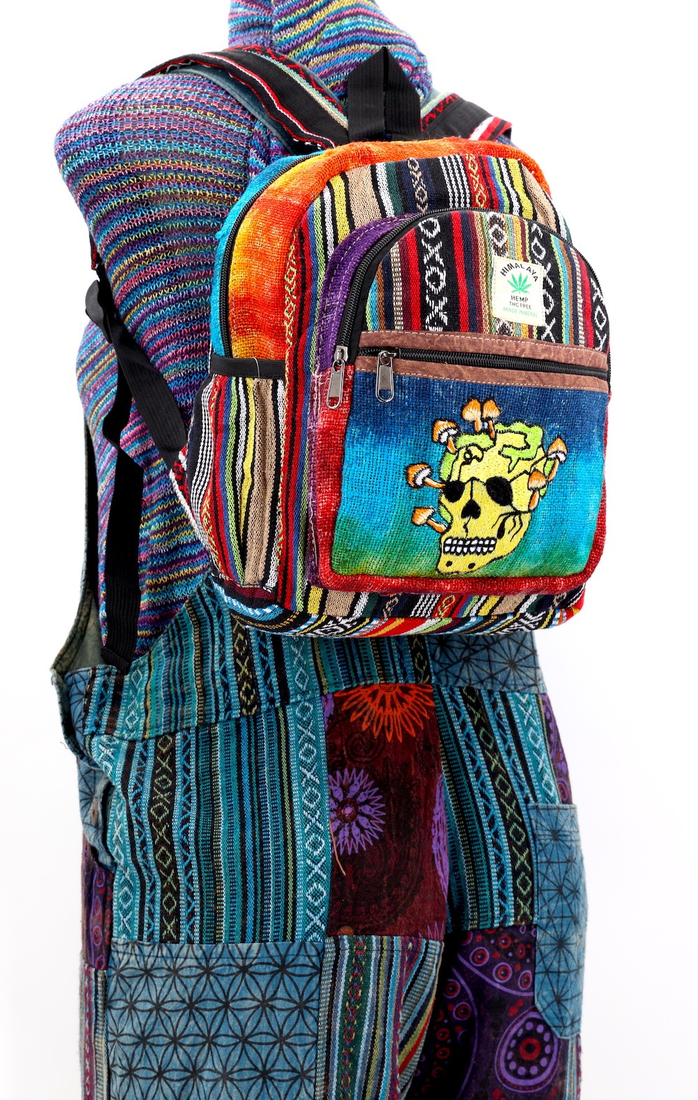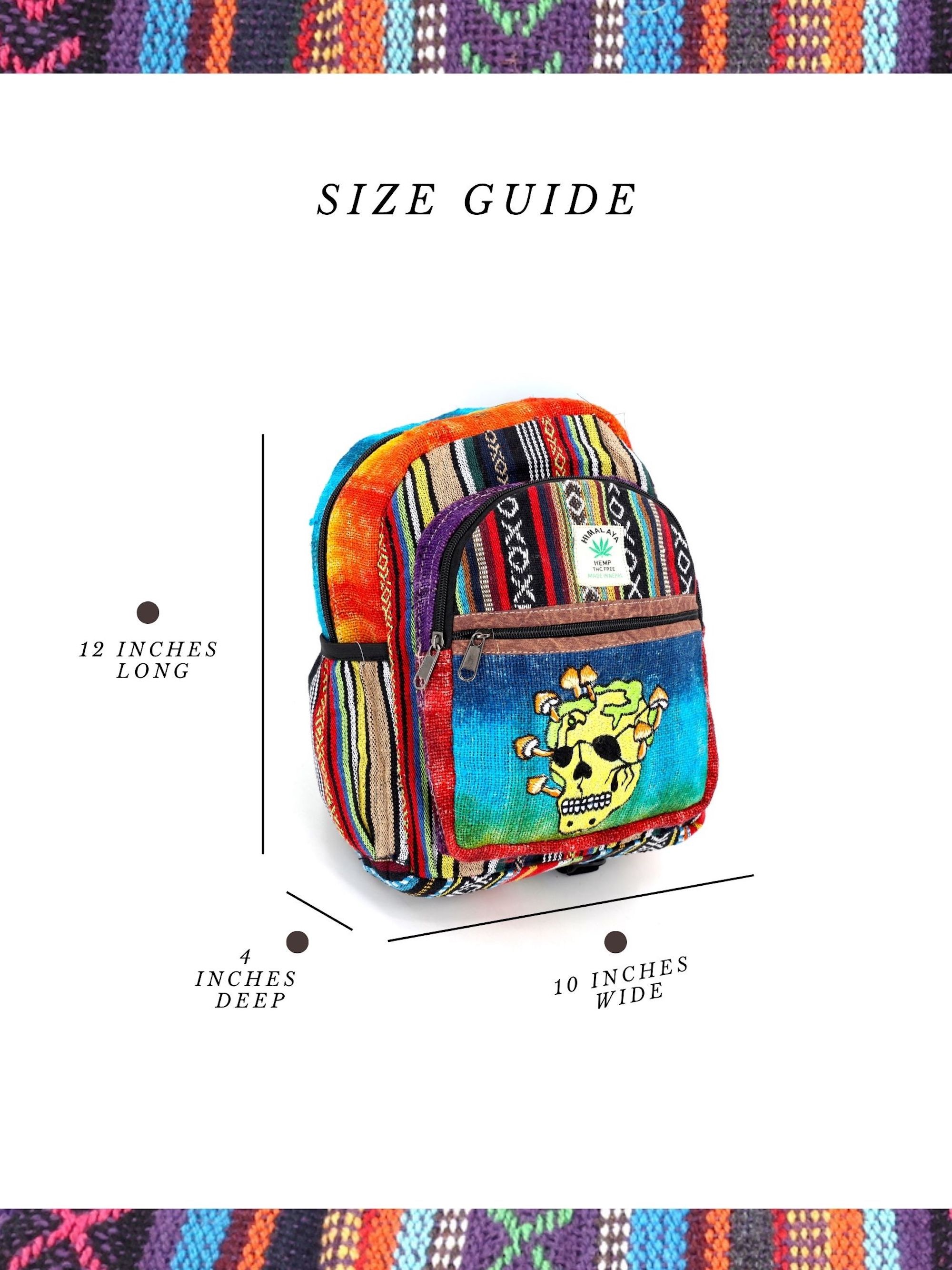 - At Himalaya Handmade we are known for creating the modern Mini hemp backpacks that are now available in a vast array of design and colors. Our Mini backpack with multicolor Aztec pattern which is made from eco-friendly natural hand-woven hemp and cotton fabric which is beautifully handcrafted in Nepal, they are of high quality and our backpacks have everything that you will need. You will not find products of higher quality anywhere else. All of our bags are sourced from the mountainous regions of Nepal and are all 100% Handmade. This backpack features are it has a unique multi colored pocket. Handcrafted this uniquely versatile Backpack comes with 2 pockets on the front both zippered and secured with a Velcro, the larger front pocket also has a zippered anti-theft pocket as well as compartment that can be used to store objects as large as 12 inches, There is also a secret back pocket which is zippered and can be used to contains various items, the bag also comes equipped with 2 water bottle holders. The bag has extremely strong construction, it has strong original two metal zippers on main compartment, soft padded straps and made from 100% Hemp, the entire bag is extremely strong but also breathable. Color of these bag will not be exact because arrangement of the pattern and the nature of these bags being handmade can cause the colors and patterns to be slightly different. Images for this bag are an overall example to what the bag looks like. Every bag is handmade and therefore unique.