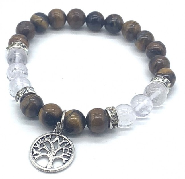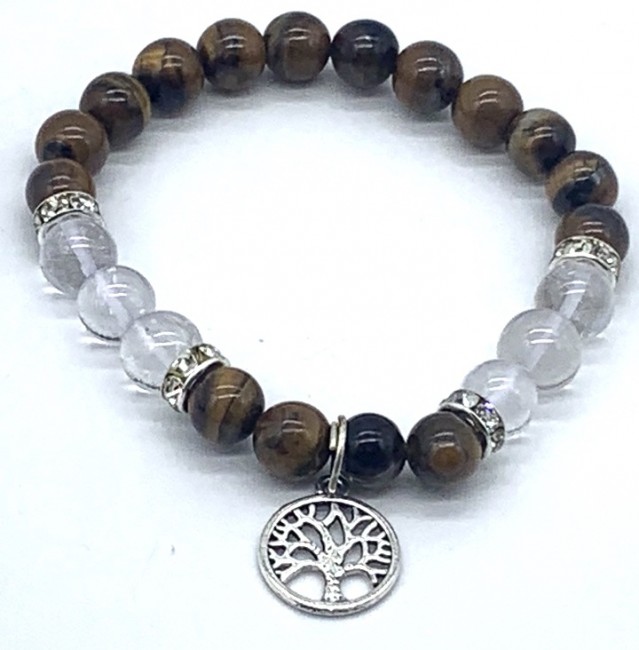 8 mm Natural Tiger Eye with clear quartz and tree of life Bracelet Elastic Yoga Gemstones Healing Energy Men & Women Stretch Bracelet