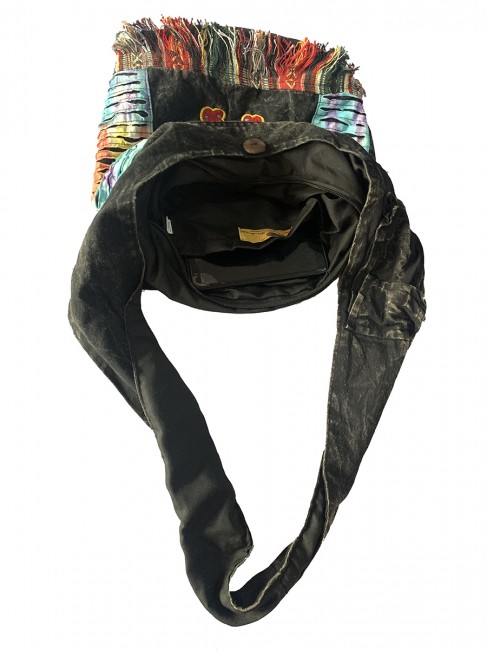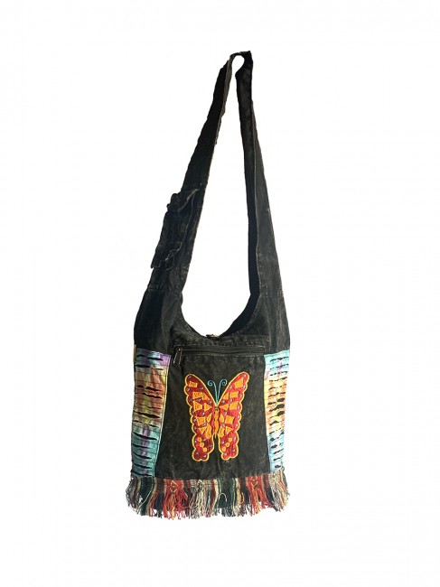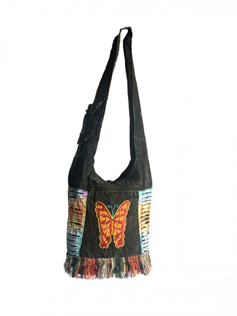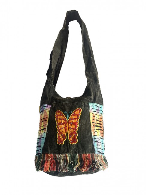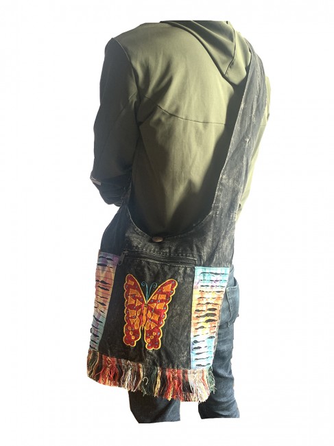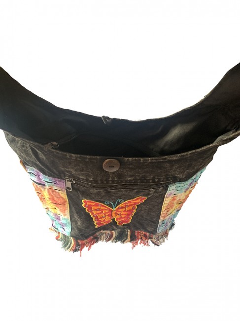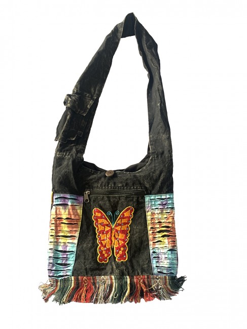 Pure 100% stone Wash cotton Butterfly hand Embroidery Yoga bag is handmade in Nepal. This Yoga bag has 3 compartments with zippers, in the main compartment it has secret pocket at 8"-7" inches also has pocket with flap cover and with velcor clouser. It is supremely versatile and fashionable. This bag is suitable for carrying passport, mobile phone and mini iPad and other nesecities. It is fair trade product. Could be hand washed or machine washed in cold water.
