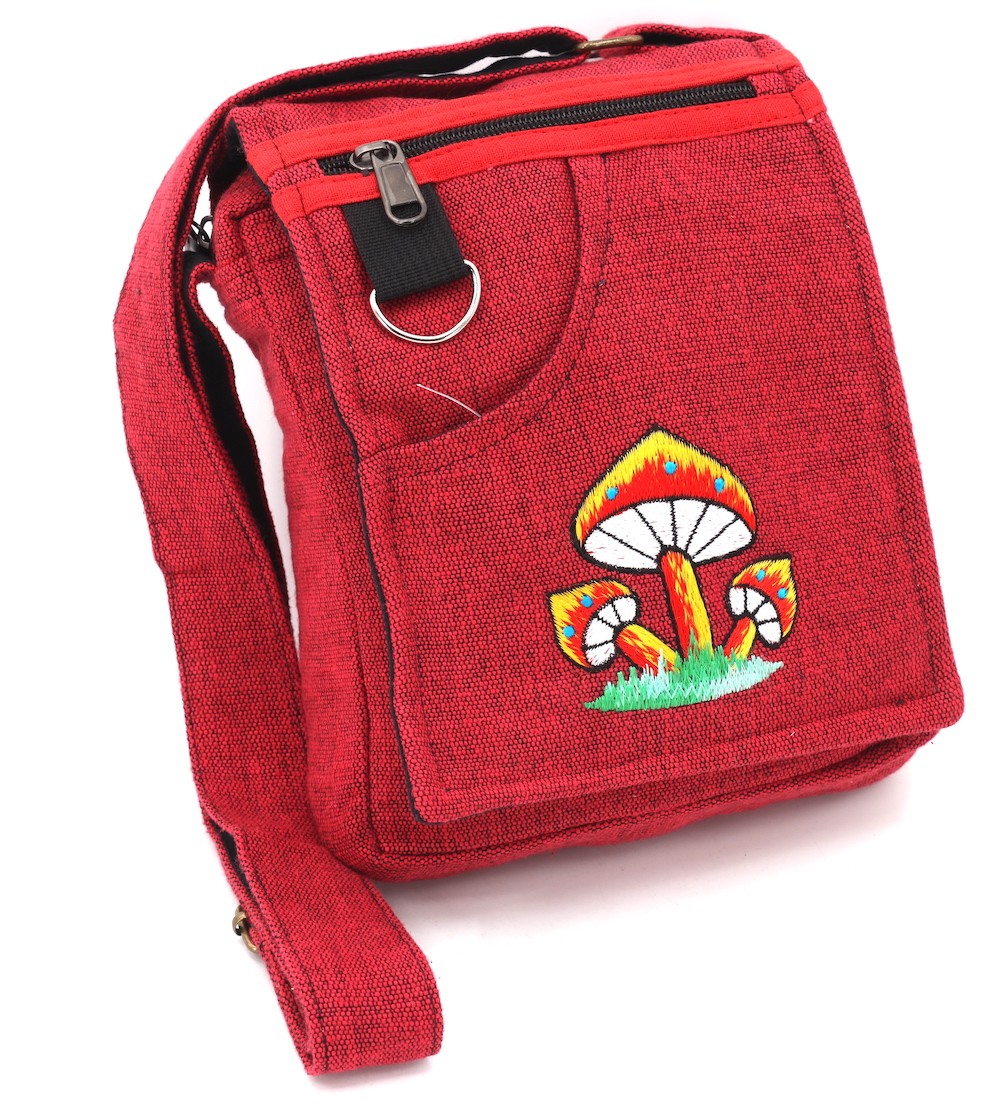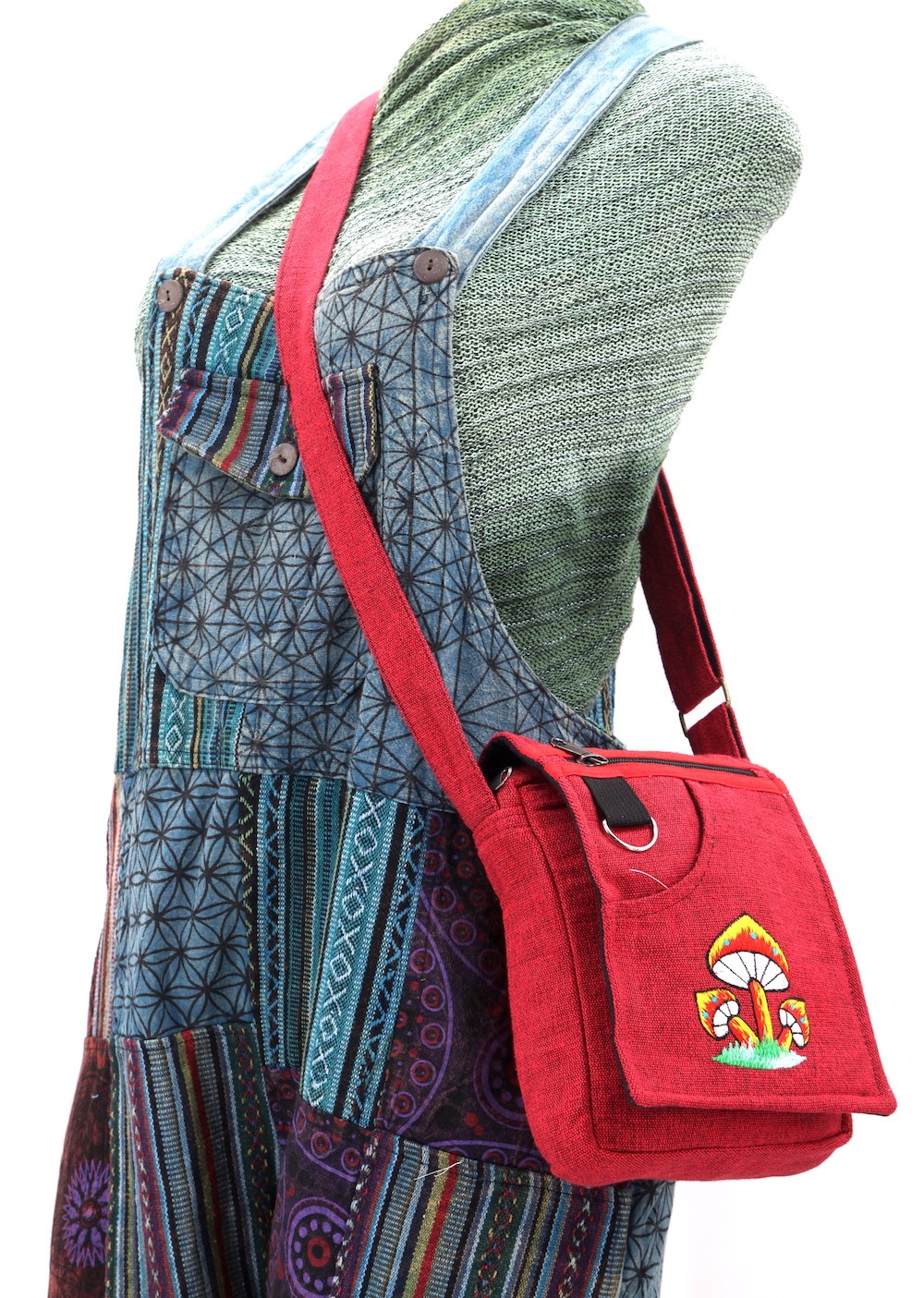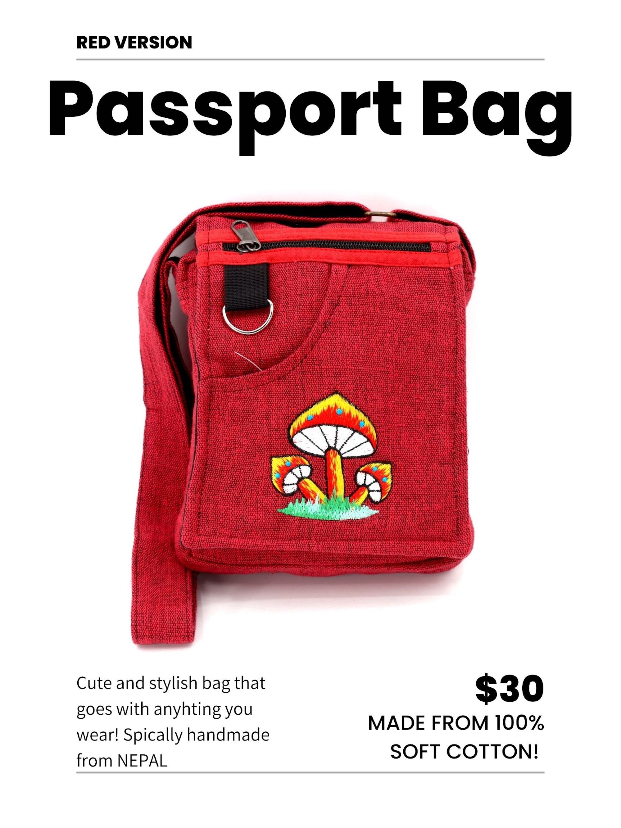 The beautiful Hand-Woven Cotton Travel bag is hand made in Nepal with pure 100% organic Himalaya Cotton. This modern Mushroom Embroidery Cotton passport bag is supremely versatile and fashionable. This bag features are it has two compartments with zippers and it has adjustable strap with outside two pockets in the front and in the main pocket above with a zipper. It is a fair trade made product.