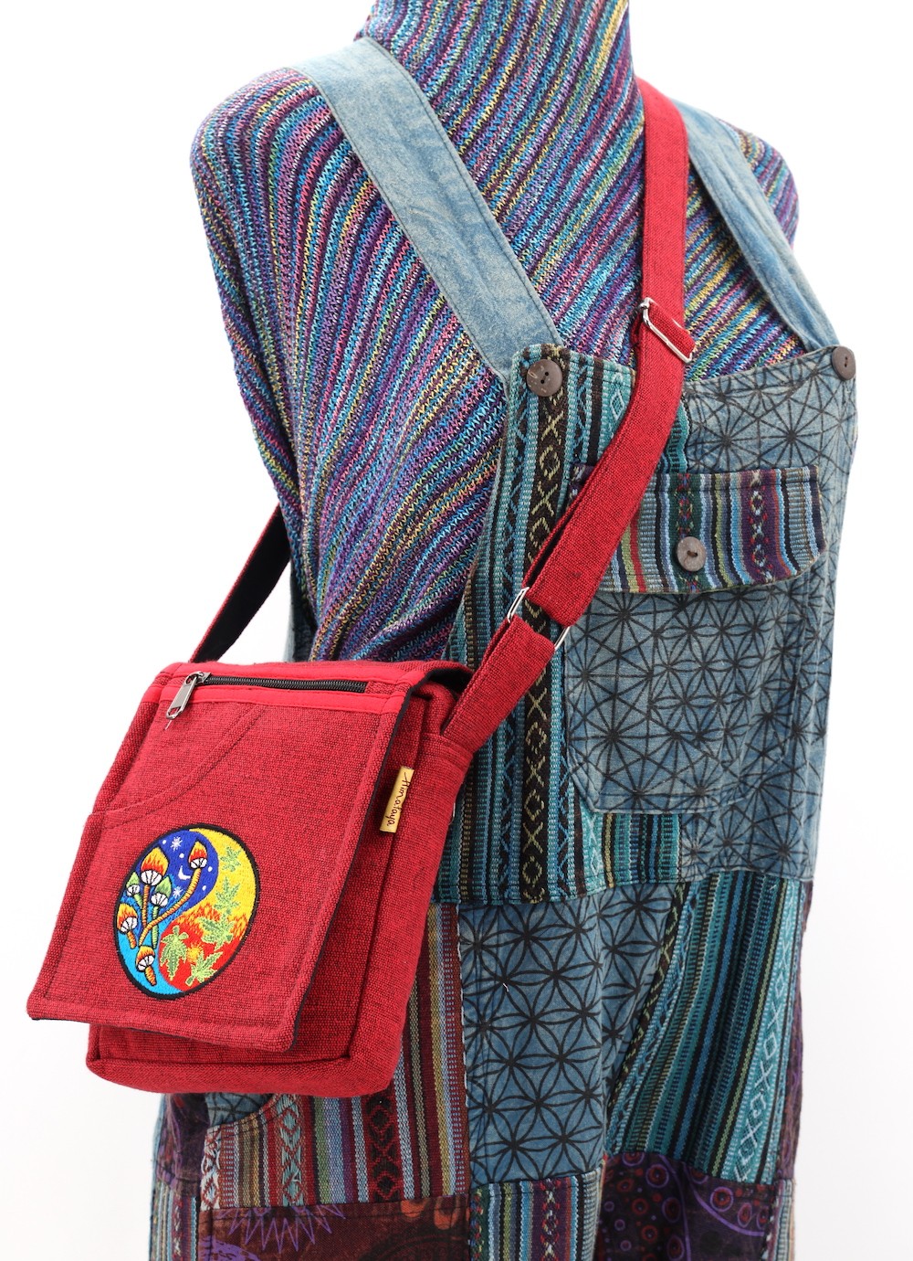 The beautiful Hand-Woven Cotton Travel bag is hand made in Nepal with pure 100% organic Himalaya Cotton. This modern Mushroom Embroidery Cotton passport bag is supremely versatile and fashionable. This bag features are it has two compartments with zippers and it has adjustable strap with outside two pockets in the front and in the main pocket above with a zipper. It is a fair trade made product.