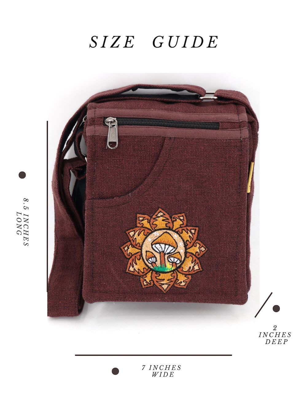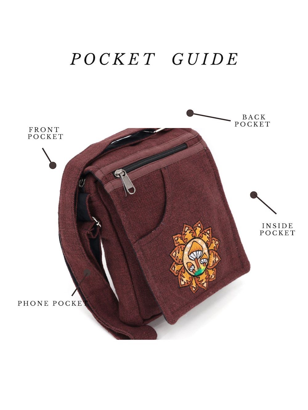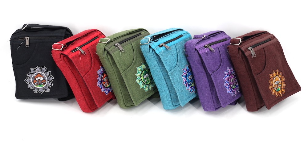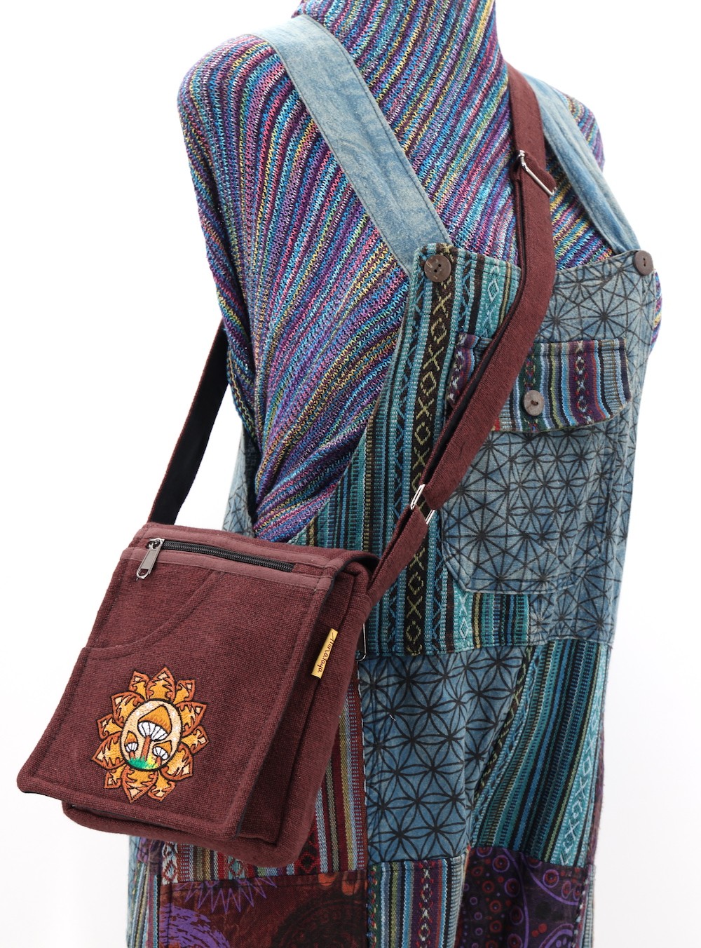 The beautiful Hand-Woven Cotton Travel bag is hand made in Nepal with pure 100% organic Himalaya Cotton. This modern Mushroom Embroidery Cotton passport bag is supremely versatile and fashionable. This bag features are it has two compartments with zippers and it has adjustable strap with outside two pockets in the front and in the main pocket above with a zipper. It is a fair trade made product.