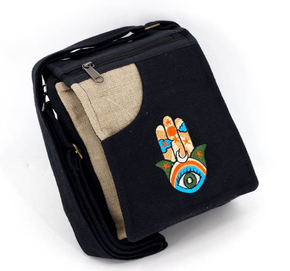 The beautiful Hand-Woven Cotton Travel bag is hand made in Nepal with pure 100% organic Himalaya Cotton. This modern Mushroom Embroidery Cotton passport bag is supremely versatile and fashionable. This bag features are it has two compartments with zippers and it has adjustable strap with outside two pockets in the front and in the main pocket above with a zipper. It is a fair trade made product.