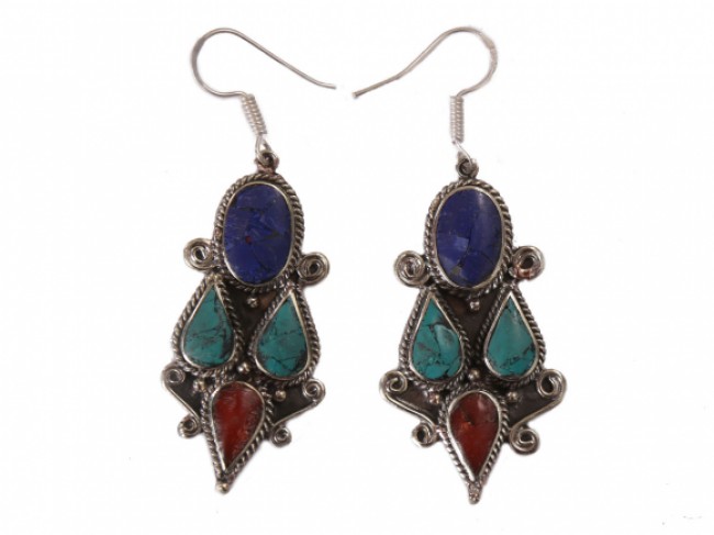 The authentic and beautiful handmade German silver earring mixed with turquoise polished stone and garnet polished stone. These earrings are both whimsical and fashionable also these earrings are authentic reflection of the ancient cultures of Nepal. From simple, classic styles to unique cocktail earrings and these styles of earring fit for any occasion. These earrings are crafted by using only simple hand tools and perfected silver pieces inset with quality gemstones. These earring unique and exotic design makes you the highlight of any crowd.
