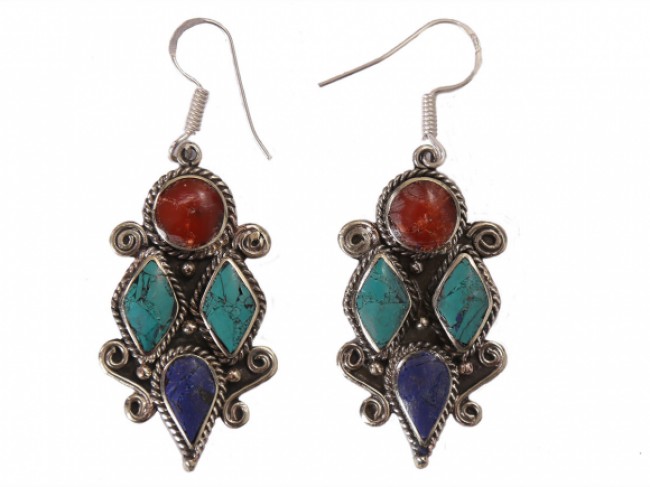 The authentic and beautiful handmade German silver earring mixed with turquoise polished stone and garnet polished stone. These earrings are both whimsical and fashionable also these earrings are authentic reflection of the ancient cultures of Nepal. From simple, classic styles to unique cocktail earrings and these styles of earring fit for any occasion. These earrings are crafted by using only simple hand tools and perfected silver pieces inset with quality gemstones. These earring unique and exotic design makes you the highlight of any crowd.