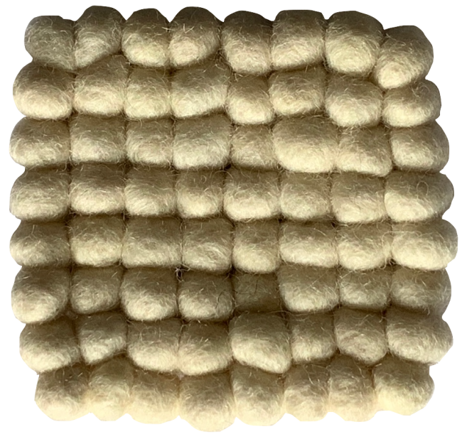 This White colored felt ball Coster is beautiful and functional. Brighten up your kitchen with this sturdy piece of handmade art! Each ball is felted by hand and strung tightly to create this piece. Although the Coster is useful to protect your wood tables from getting burned by hot pans, some prefer this lovely piece as a wall decoration. The felt Coster measuring 10 cm in diameter is made of felt balls hand sewn together for durability. 100% felt wool balls. It’s Washing machine friendly. This is fair trade product and made.