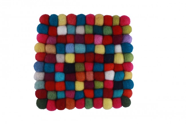 This multi colored felt ball hot pad (Trivet) is beautiful and functional. Brighten up your kitchen with this sturdy piece of handmade art! Each ball is felted by hand and strung tightly to create this piece. Although the hot pad is useful to protect your wood tables from getting burned by hot pans, some prefer this lovely piece as a wall decoration. The felt trivet measuring 20 cm in diameter is made of felt balls hand sewn together for durability. 100% felt wool balls. It’s Washing machine friendly. This is fair trade product and made.
