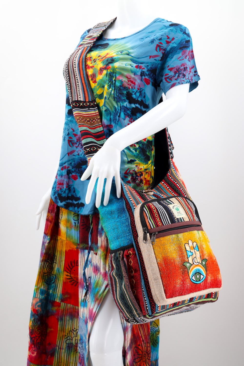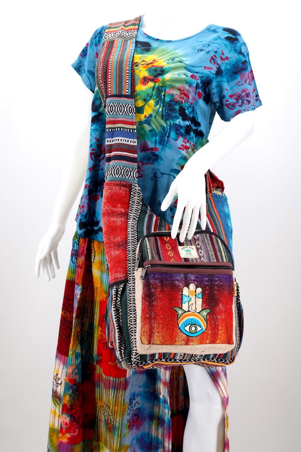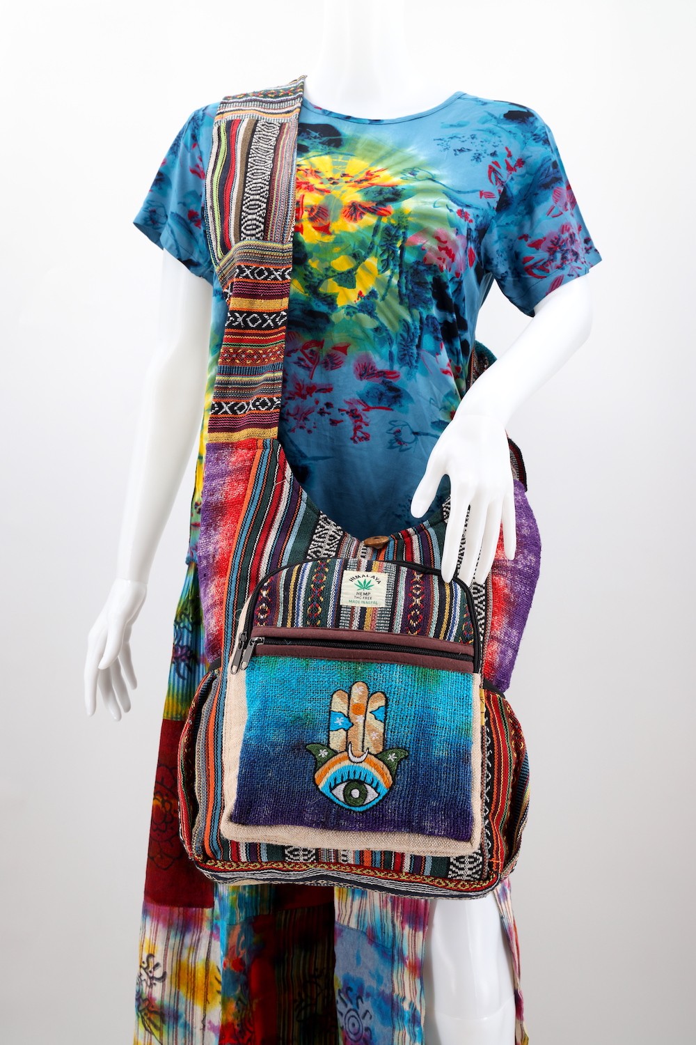 A versatile and beautiful humsa embroidery colorful 100% Natural Handwoven Hemp stitched by talented artisans in Himalaya range of Nepal. Purchasing means supporting underprivileged Nepalese communities who help make these bags.