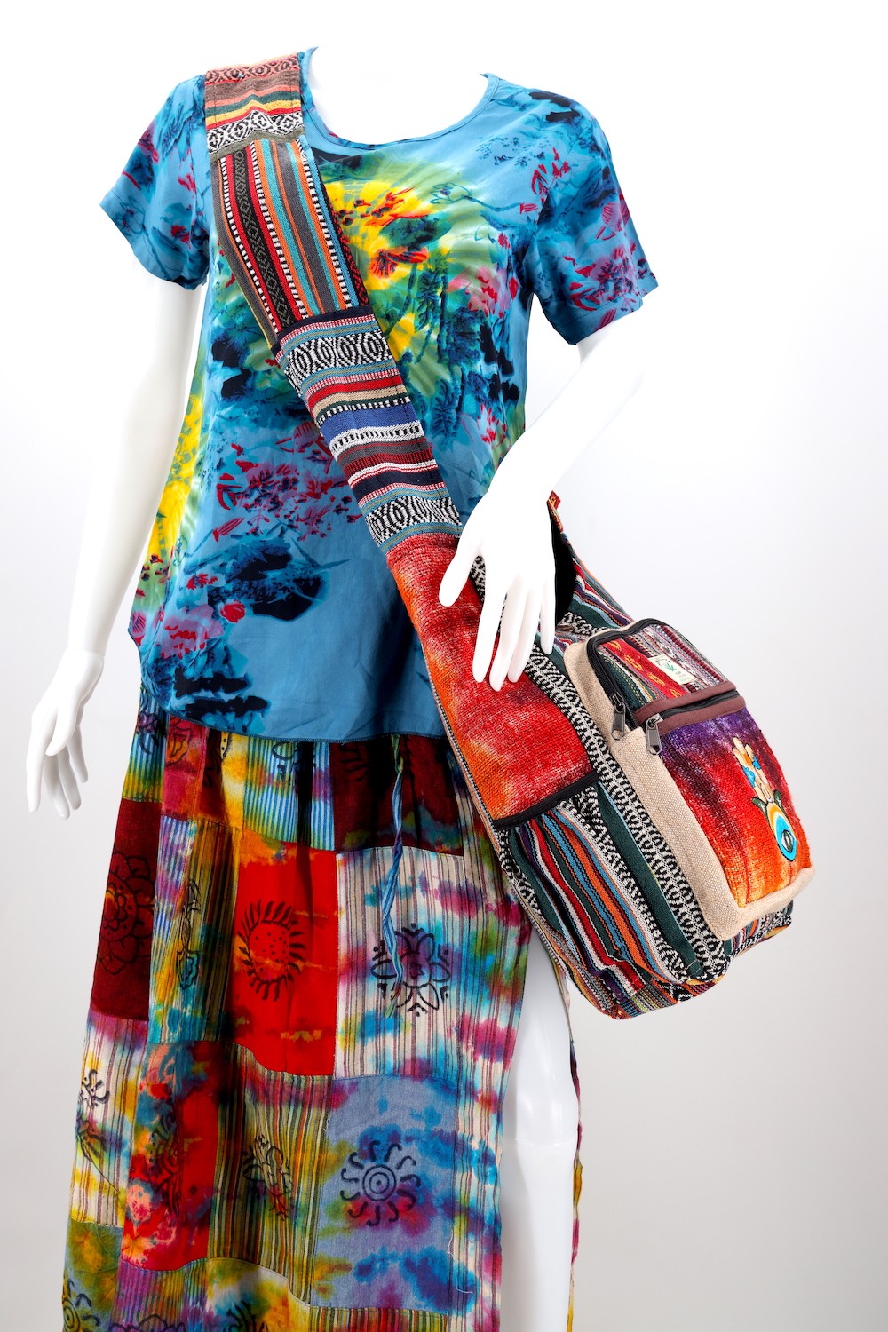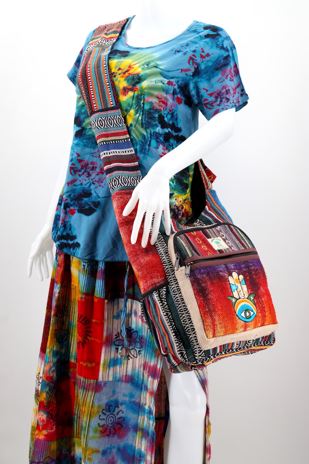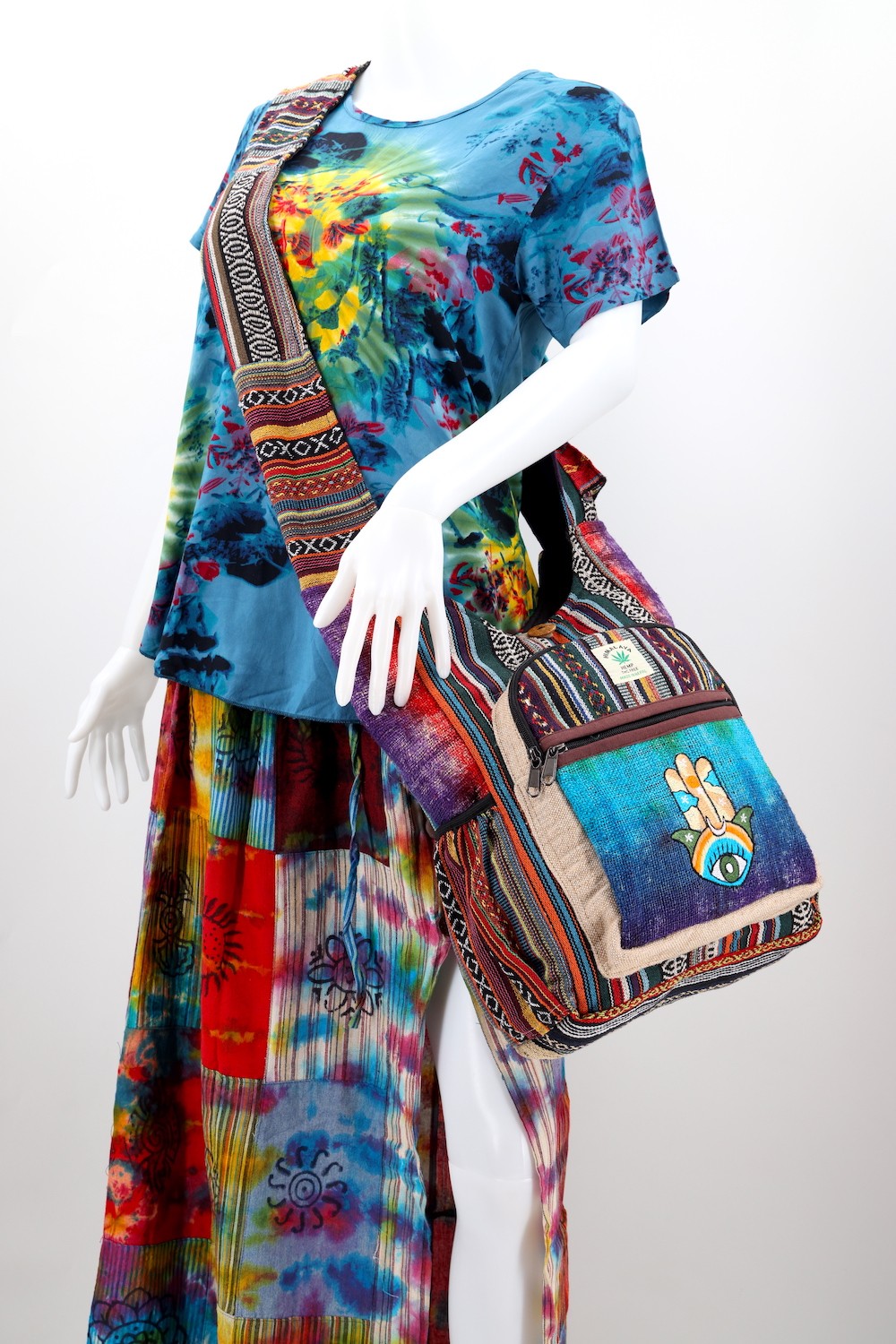 A versatile and beautiful humsa embroidery colorful 100% Natural Handwoven Hemp stitched by talented artisans in Himalaya range of Nepal. Purchasing means supporting underprivileged Nepalese communities who help make these bags.