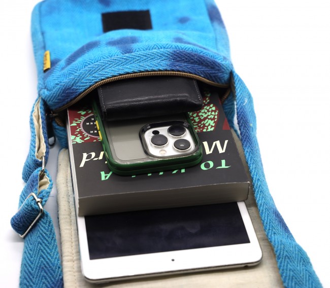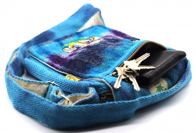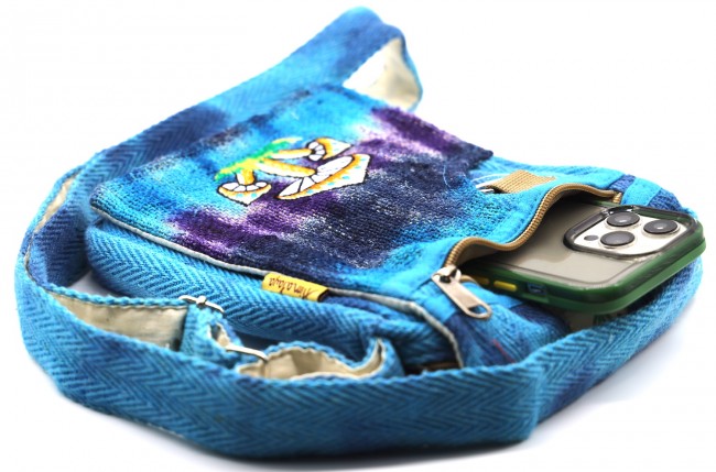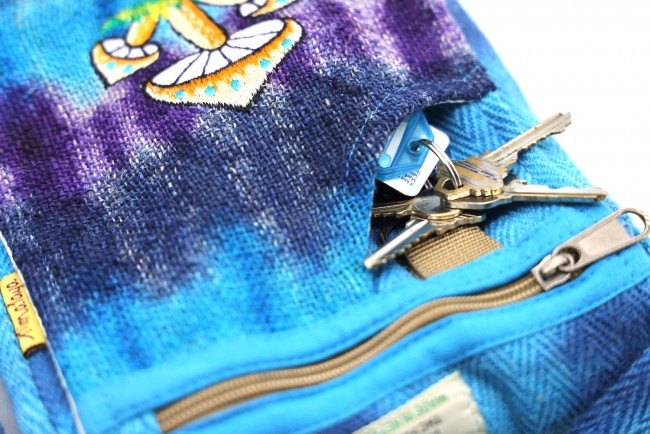 The beautiful hemp Travel bag is hand made in Nepal with pure 100% organic Himalaya hemp. This modern hemp passport bag is supremely versatile and fashionable. This bag features are it has two compartments with zippers and it has adjustable strap with outside two pockets in the front and in the main pocket above with a zipper. It is a fair trade made product.