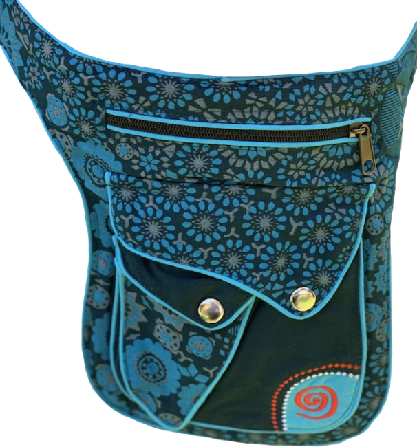 100% pure cotton colorful money belt handmade in Nepal. This product can be use by both man and women. This bag has charming features, it has beautiful print and Spiral embroideries,it is practical and versatile because it can be belt bag/fanny pack /shoulder bag, it has 3 pocket with zippers, main pocket has magnetic button, 1 pocket is hidden on the back side, small pocket on the outside also has magnetic button, the belt is adjustable which can make shorter and longer as well. It is fair trade product.