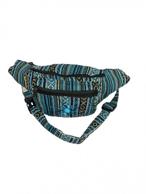 100% pure Hand woven Gheri Cotton Multi Black Color Sun Hand Embroidary money belt (Fanny Pack) handmade in Nepal. This product can be use by both men and women west or can be worn lower on the hips. This bag has charming features, it is practical and versatile because it can be belt bag/fanny pack /shoulder bag, it has 3 pockets with zippers, the belt is adjustable 32 - 45 inch which can make shorter and longer as well. It is fair trade product. Size: 29 x14x10 cm (12.5x5.5x4 inches)