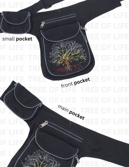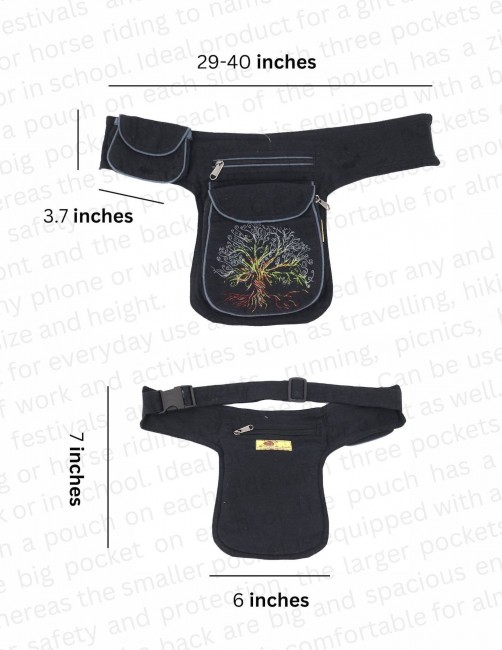 100% pure cotton Tree of Life designed Fanny Pack is handmade in Nepal. This product can be used by women or men and is usually worn lower on the hips. This bag has charming features, it has a beautiful print of the Tree of life, it is practical and versatile because it can be used as a belt bag, fanny pack as well as a shoulder bag, it has 3 pockets in the front with zippers and additionally all three pockets come equipped with a zipper, A pocket is hidden on the back side, the belt is adjustable from 29 - 40 inches which can be made shorter and longer to tend to your needs, and the belt also includes a small compartment which is big enough to fit coins and money. This is a Fair-Trade product.