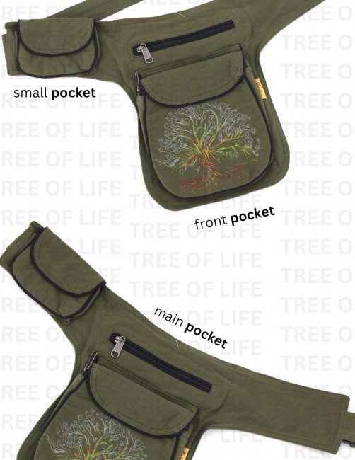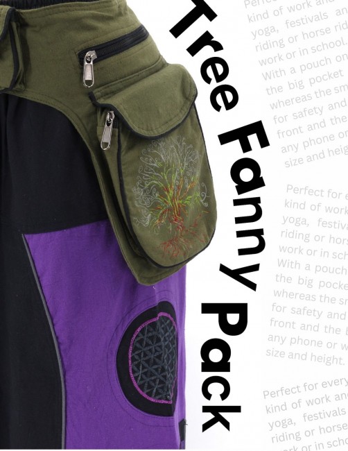 100% pure cotton Tree of Life designed Fanny Pack is handmade in Nepal. This product can be used by women or men and is usually worn lower on the hips. This bag has charming features, it has a beautiful print of the Tree of life, it is practical and versatile because it can be used as a belt bag, fanny pack as well as a shoulder bag, it has 3 pockets in the front with zippers and additionally all three pockets come equipped with a zipper, A pocket is hidden on the back side, the belt is adjustable from 29 - 40 inches which can be made shorter and longer to tend to your needs, and the belt also includes a small compartment which is big enough to fit coins and money. This is a Fair-Trade product.
