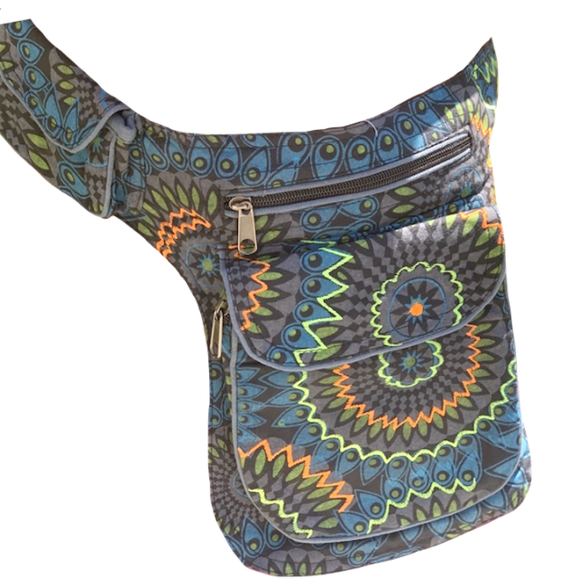 100% pure cotton colorful money belt handmade in Nepal. This product can be use by both man and women. This bag has charming features, it has beautiful print and flower embroideries,it is practical and versatile because it can be belt bag/fanny pack /shoulder bag, it has 3 pocket with zippers, main pocket has magnetic button, 1 pocket is hidden on the back side, small pocket on the outside also has magnetic button, the belt is adjustable which can make shorter and longer as well. It is fair trade product.