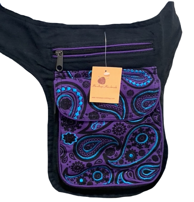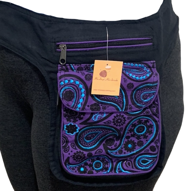 100% pure cotton colorful money belt handmade in Nepal. This product can be use by both man and women. This bag has charming features, it has beautiful print and flower embroideries,it is practical and versatile because it can be belt bag/fanny pack /shoulder bag, it has 3 pocket with zippers, main pocket has magnetic button, 1 pocket is hidden on the back side, small pocket on the outside also has magnetic button, the belt is adjustable which can make shorter and longer as well. It is fair trade product.