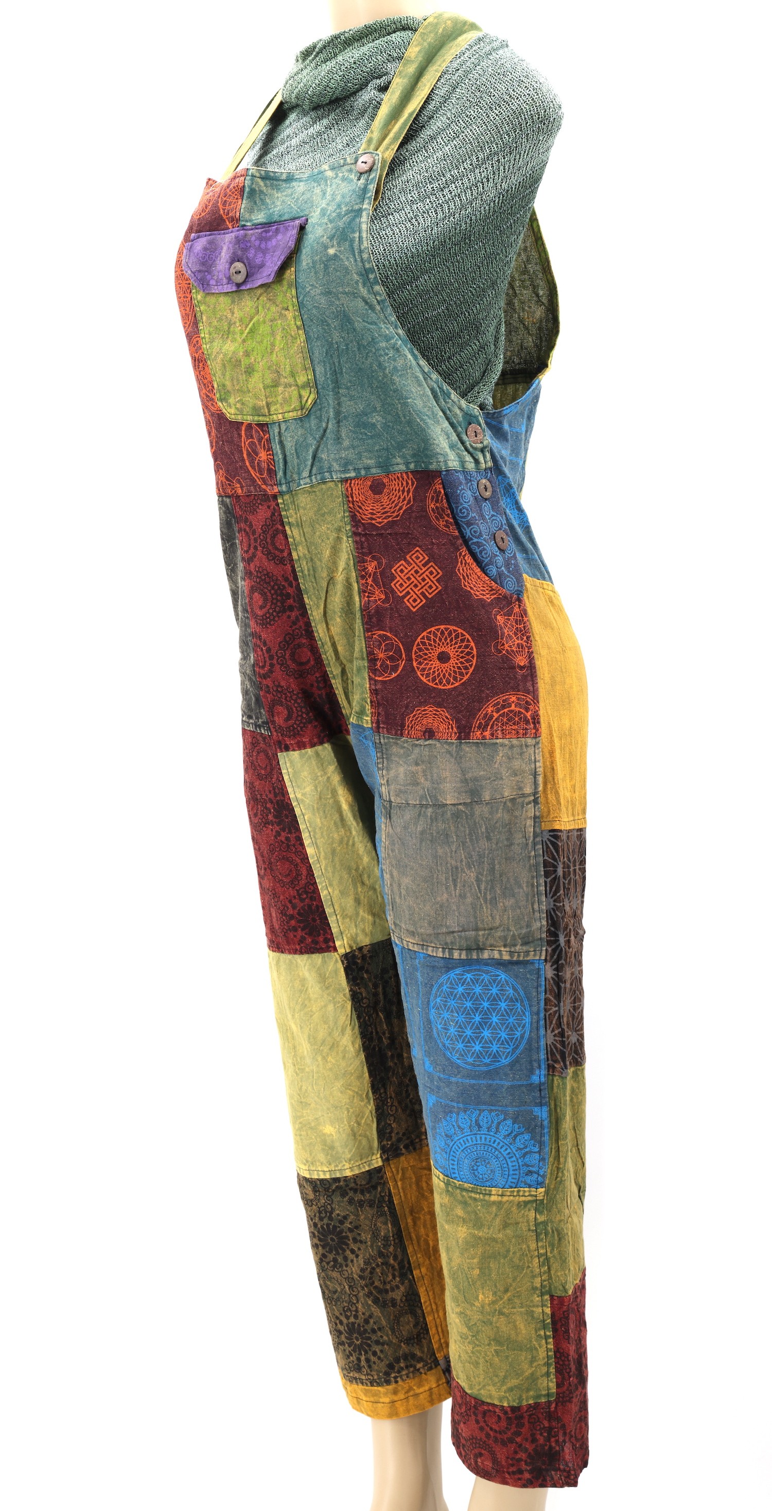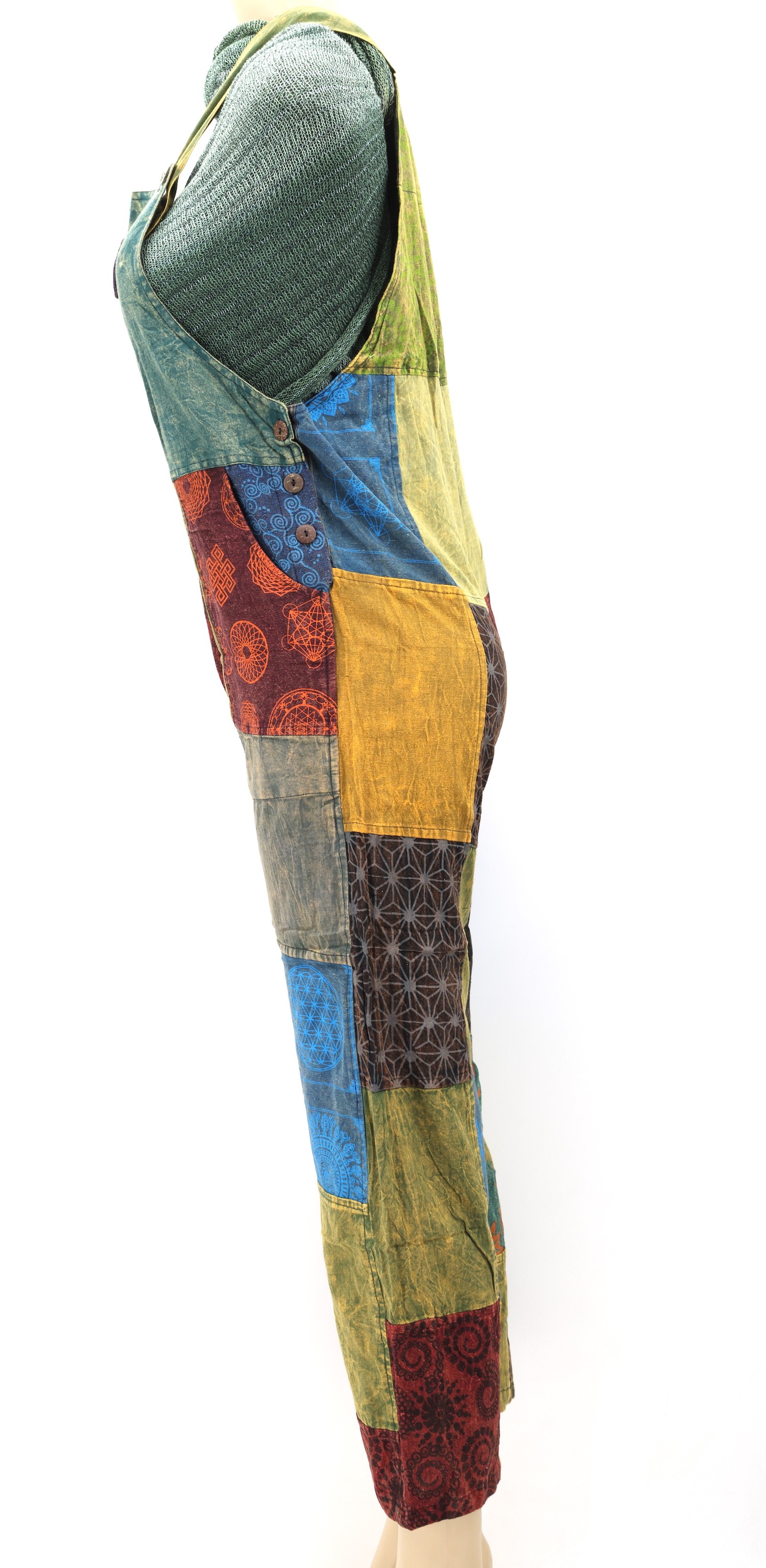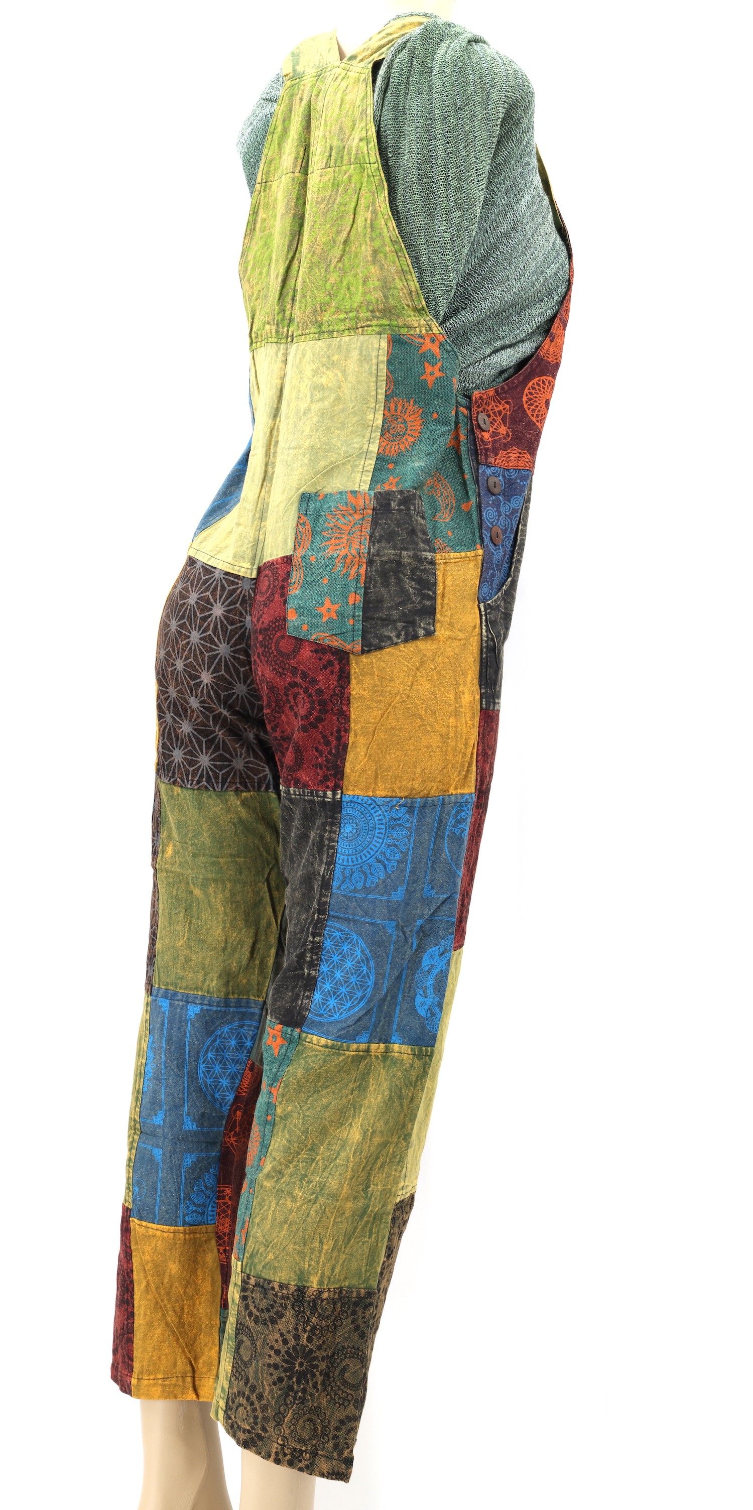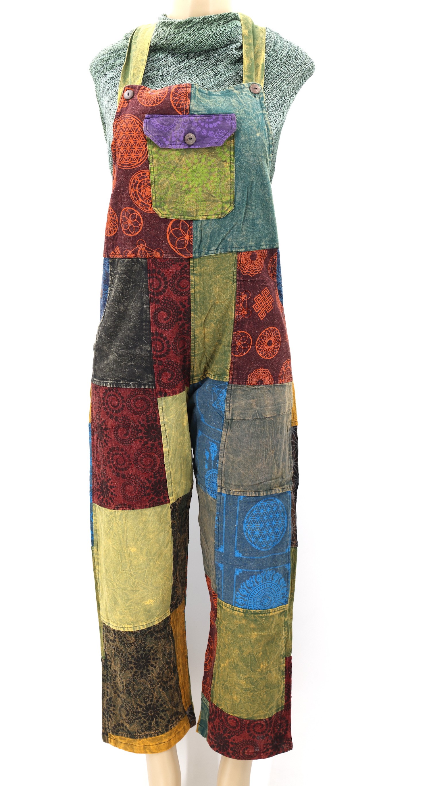 A versatile and beautiful Hand Print Patch Colorful Overall 100% Natural Cotton Fabric stitched by talented artisans in Himalaya range of Nepal. Support underprivileged Nepalese communities with your purchase.