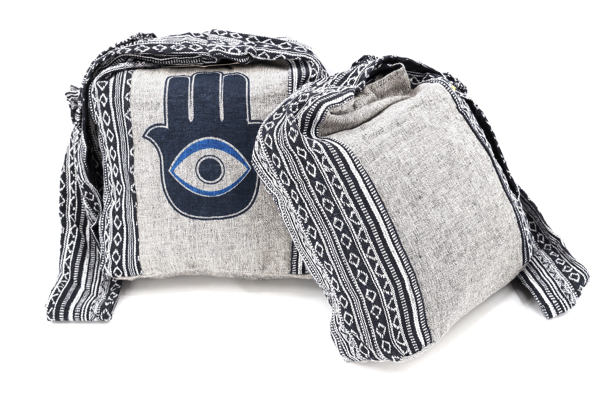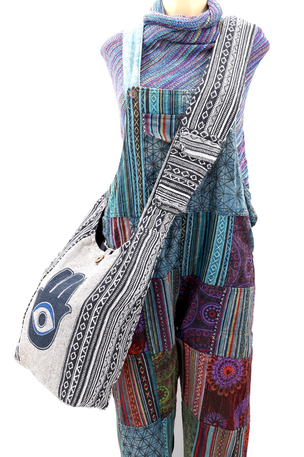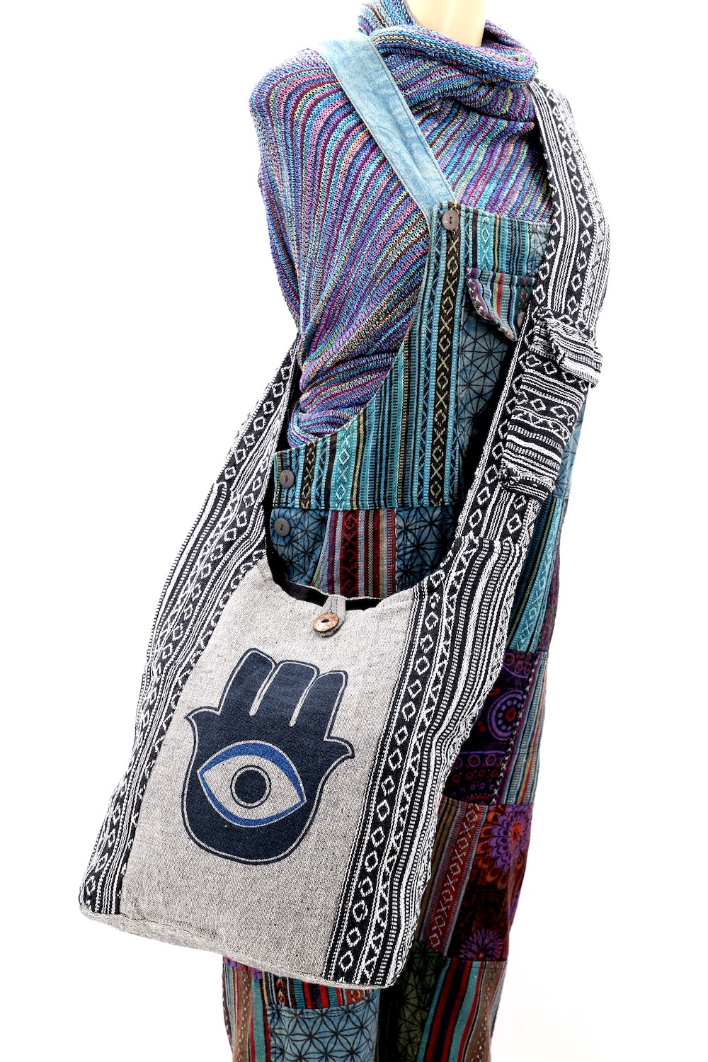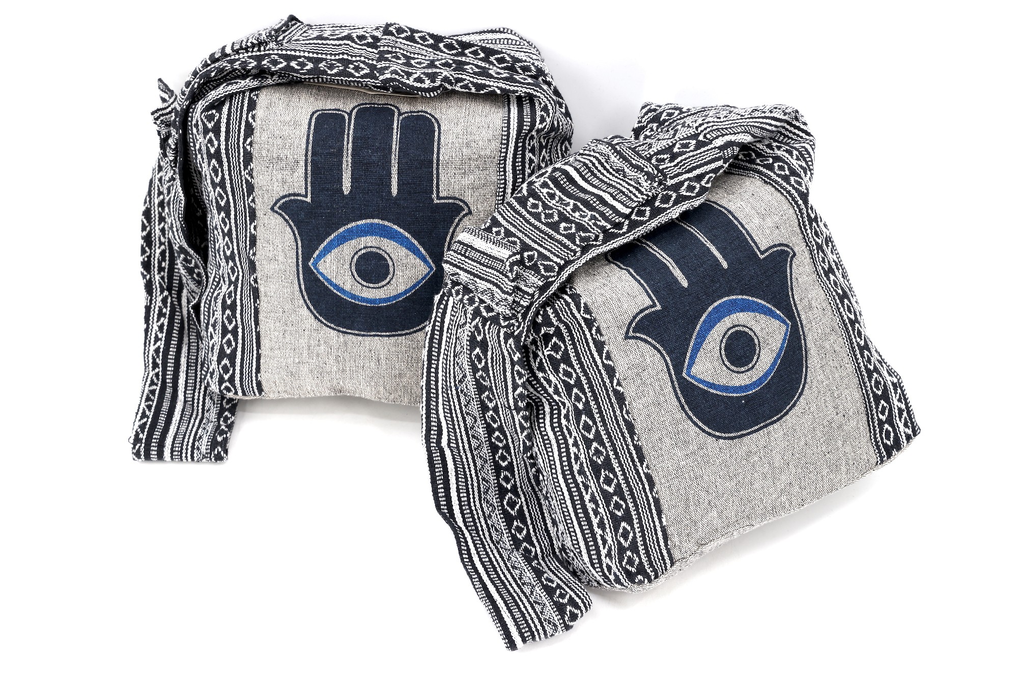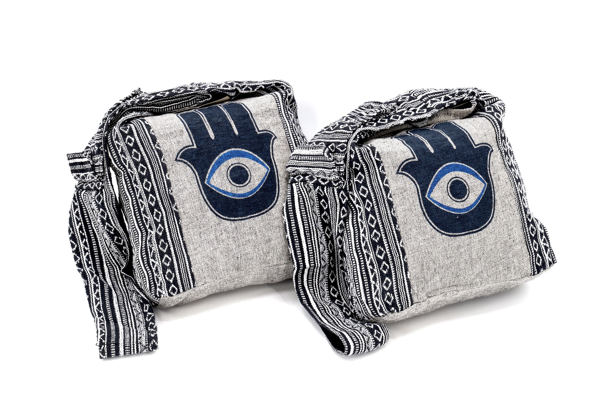 A versatile and beautiful Hamsa Evil Eye Print Handmade Cotton Crossbody Bag made with 100 percent natural handwoven cotton. Stitched and assembled by the most talented artisans in Nepal.