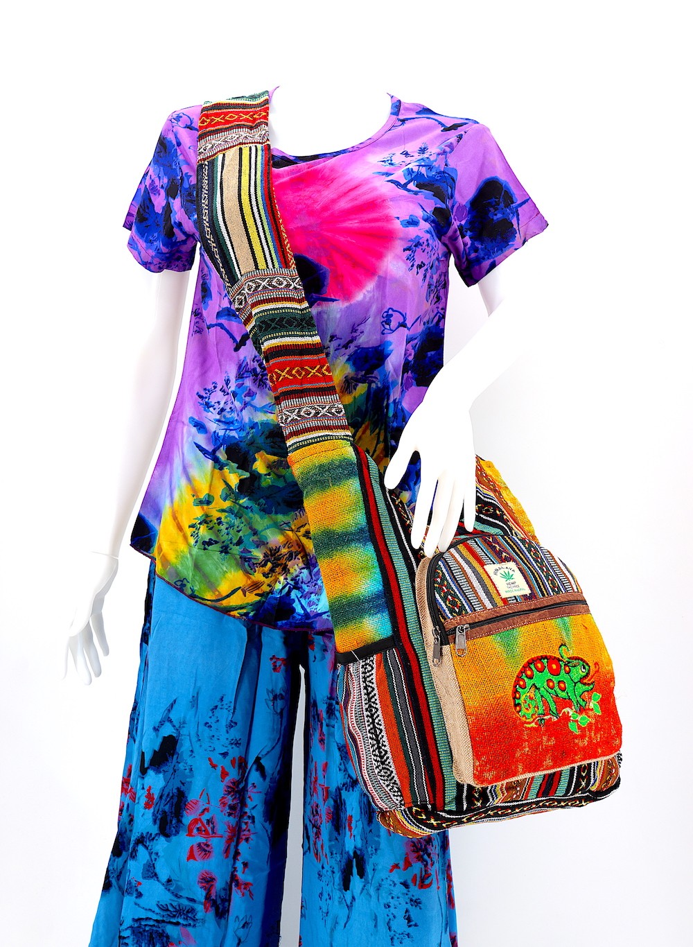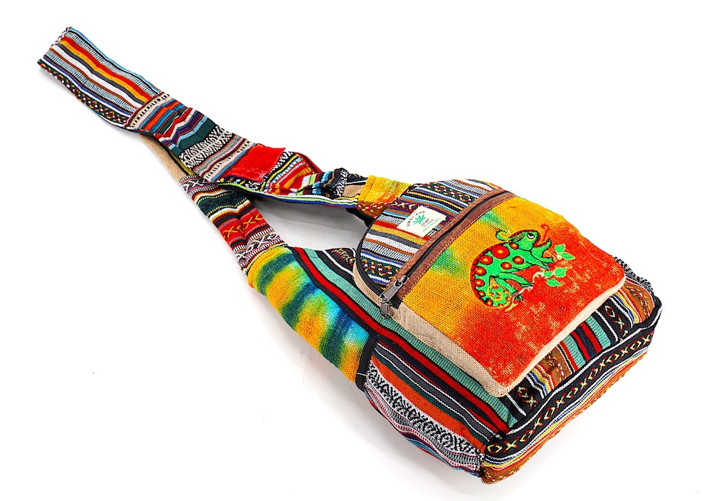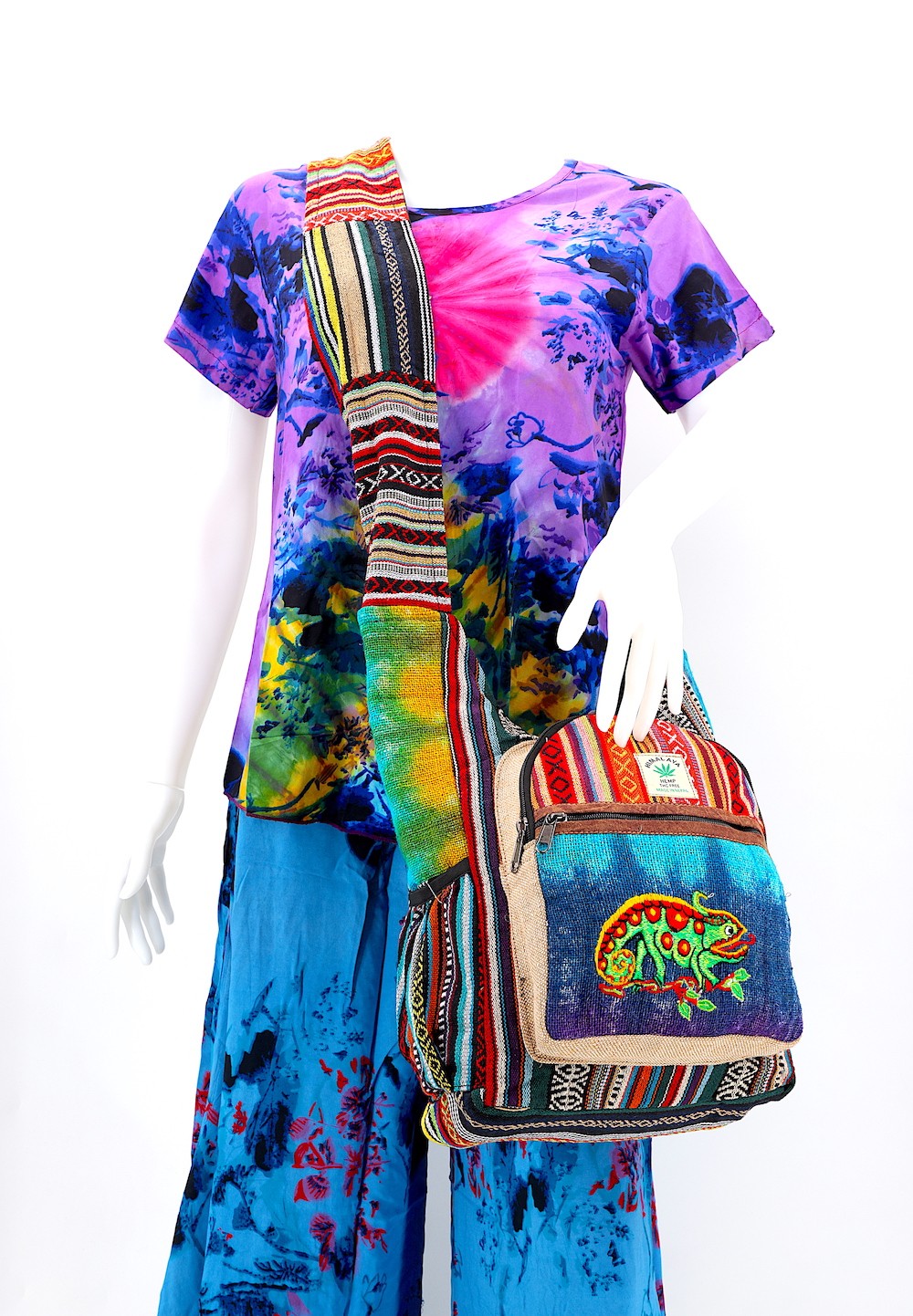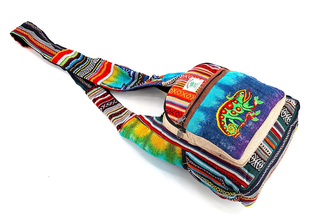A versatile and beautiful Chameleon embroidered colorful 100% Natural Handwoven Hemp Shoulder Bag stitched by talented artisans in Himalaya range of Nepal. Purchasing means supporting underprivileged Nepalese communities who help make these bags.