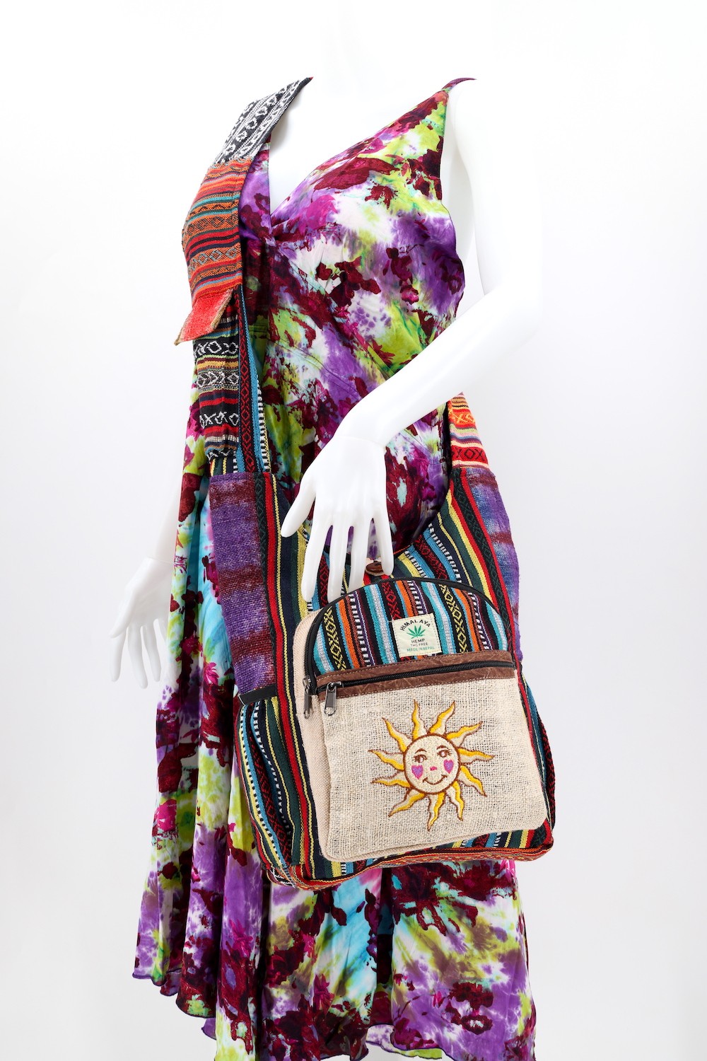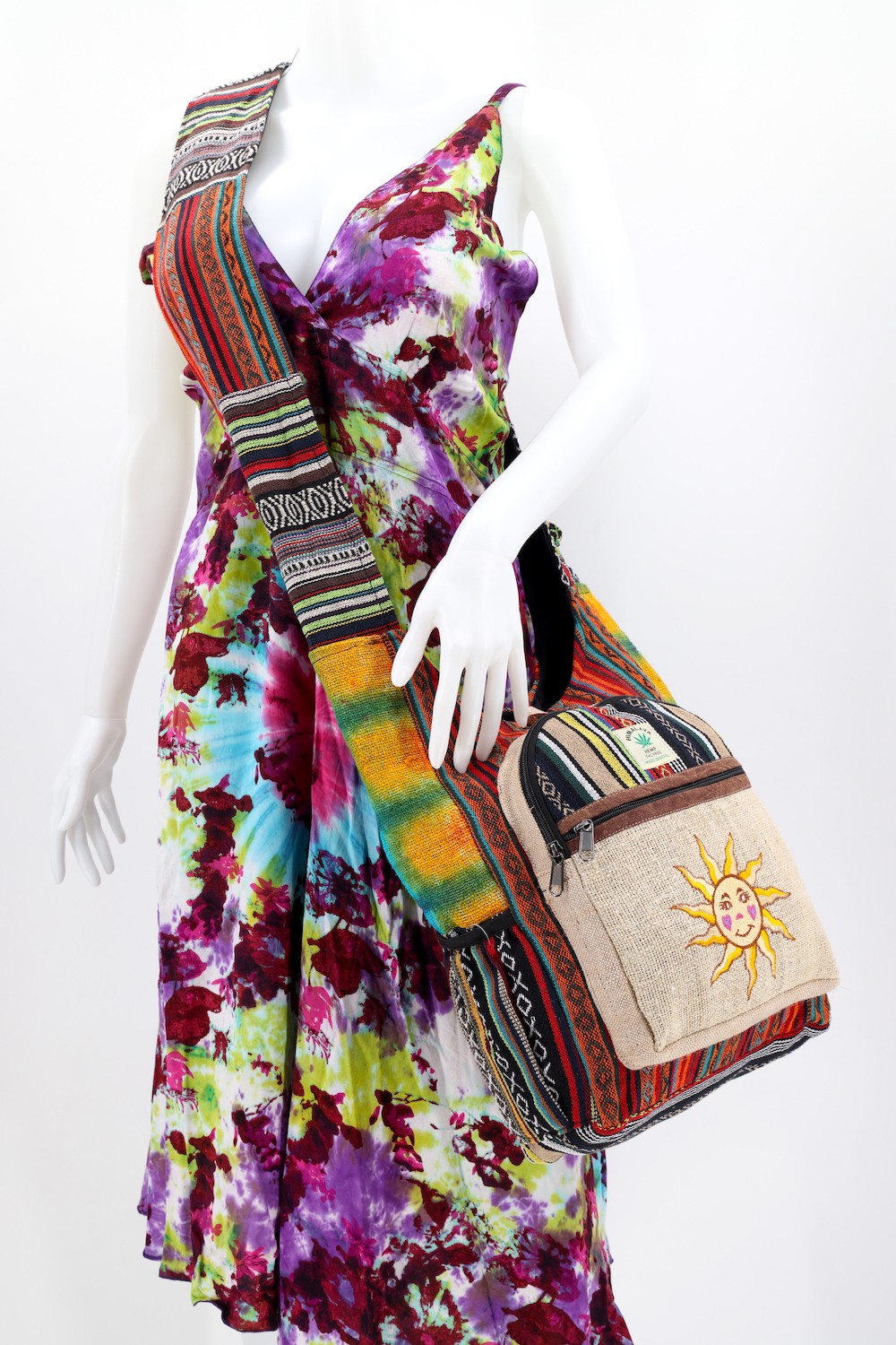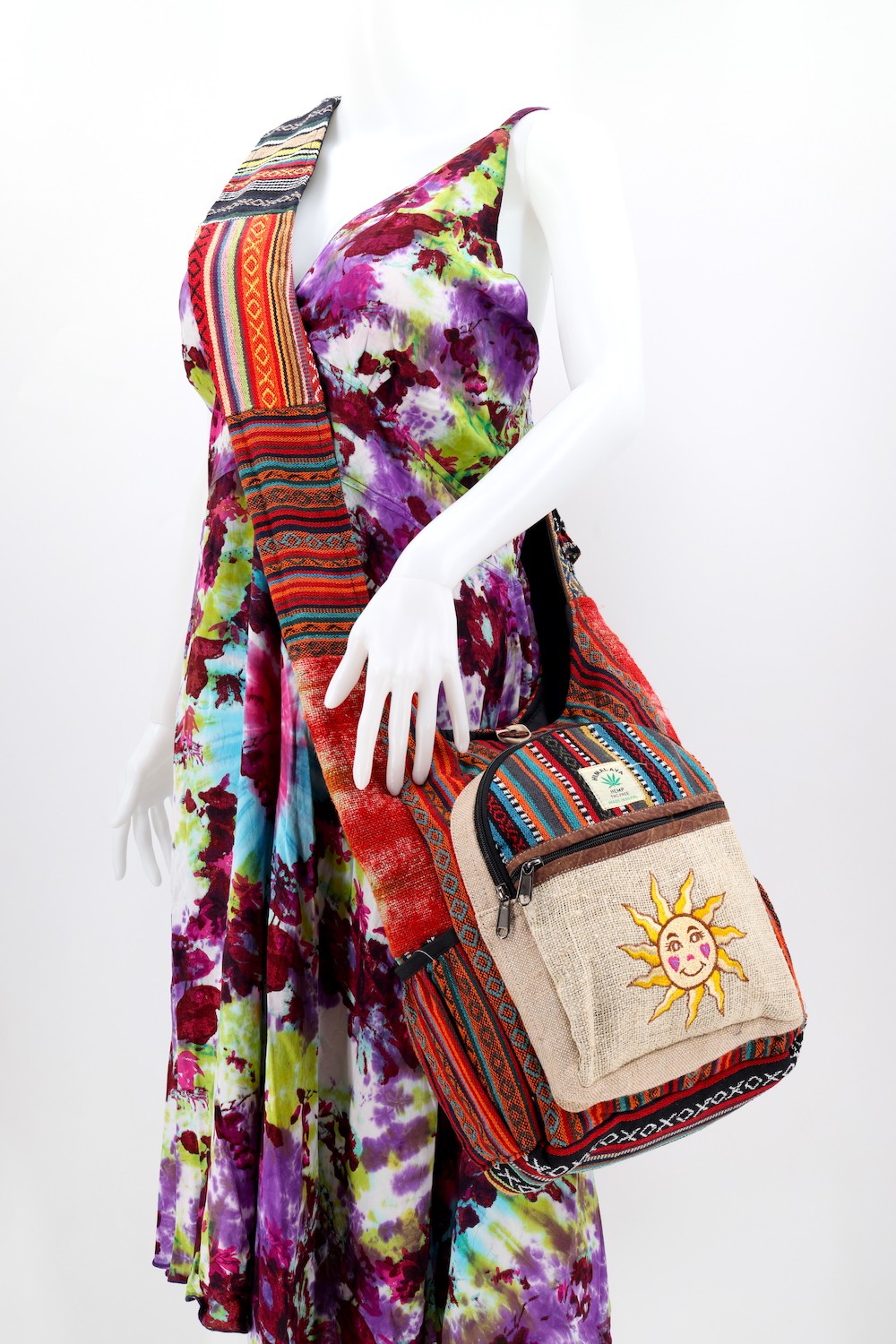 A versatile and beautiful sun embroidery colorful 100% Natural Handwoven Hemp stitched by talented artisans in Himalaya range of Nepal. Purchasing means supporting underprivileged Nepalese communities who help make these bags.