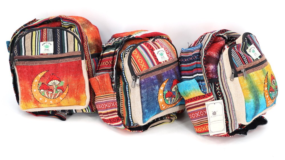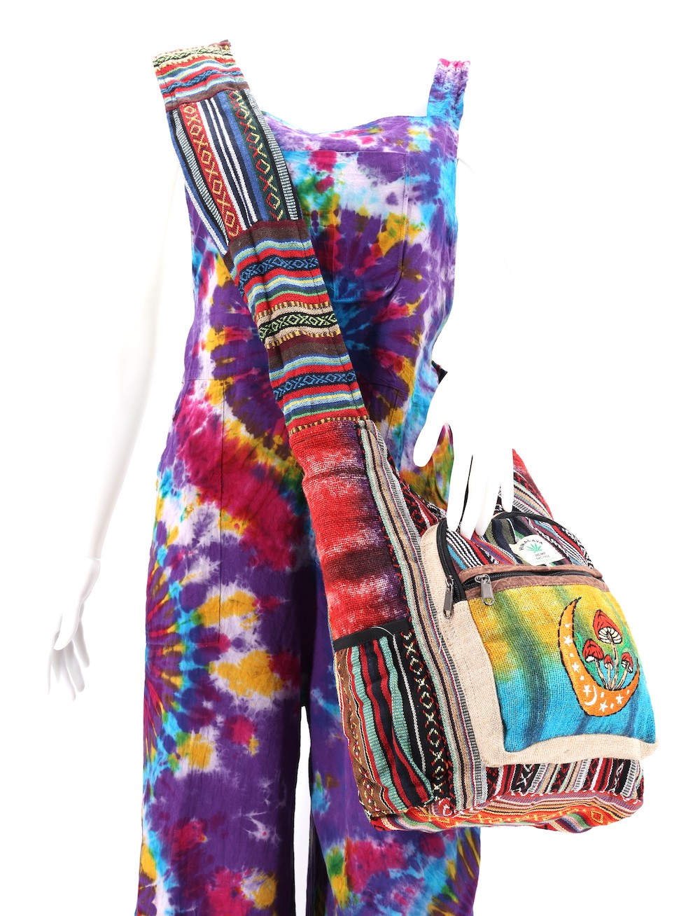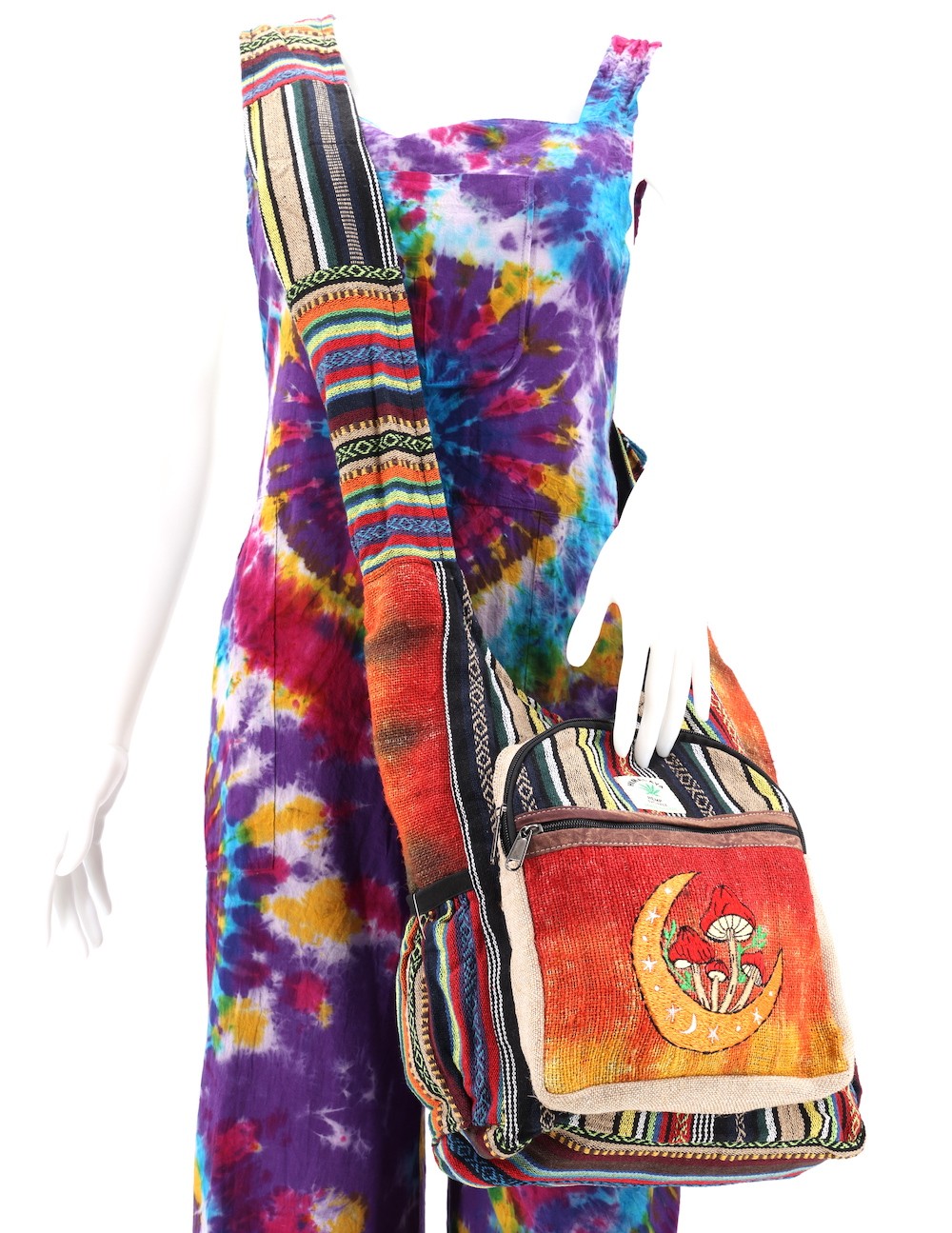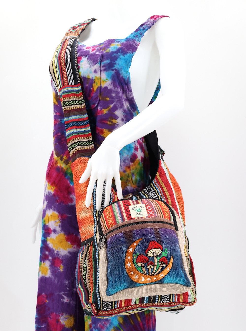 A versatile and beautiful Moon Mushroom embroidery colorful 100% Natural Handwoven Hemp Crossbody Bag stitched by talented artisans in Himalaya range of Nepal. Purchasing means supporting underprivileged Nepalese communities who help make these bags.