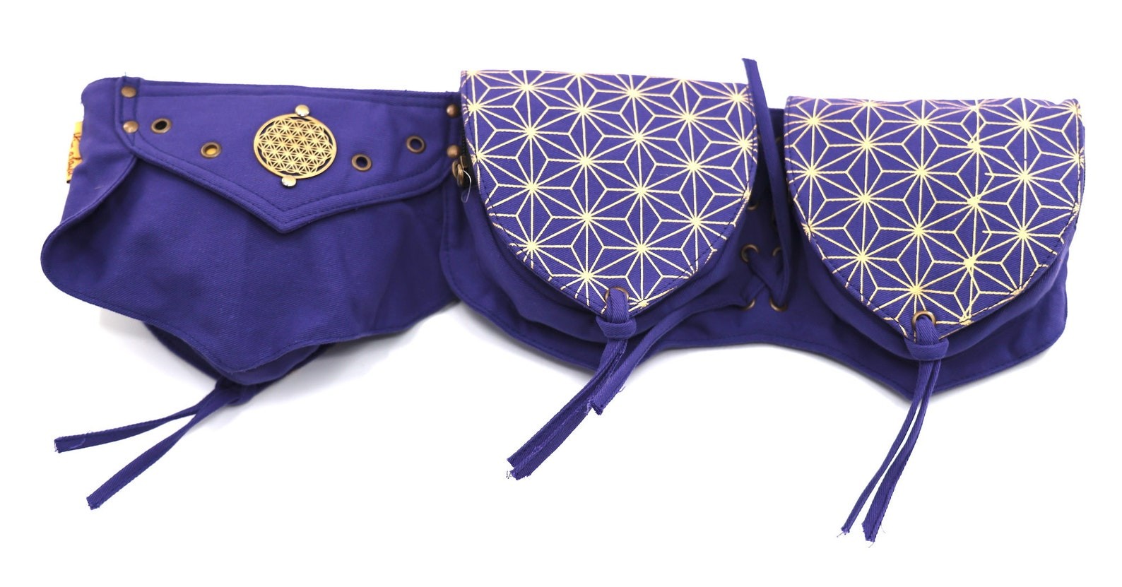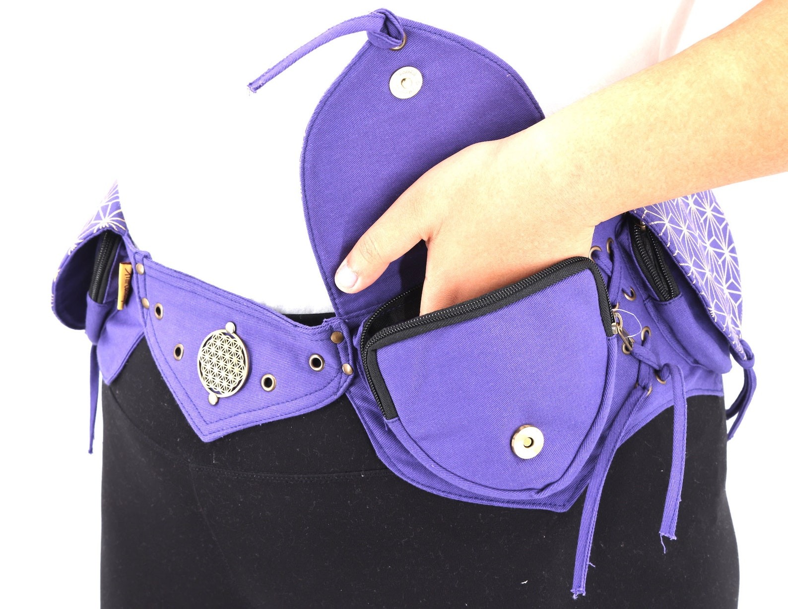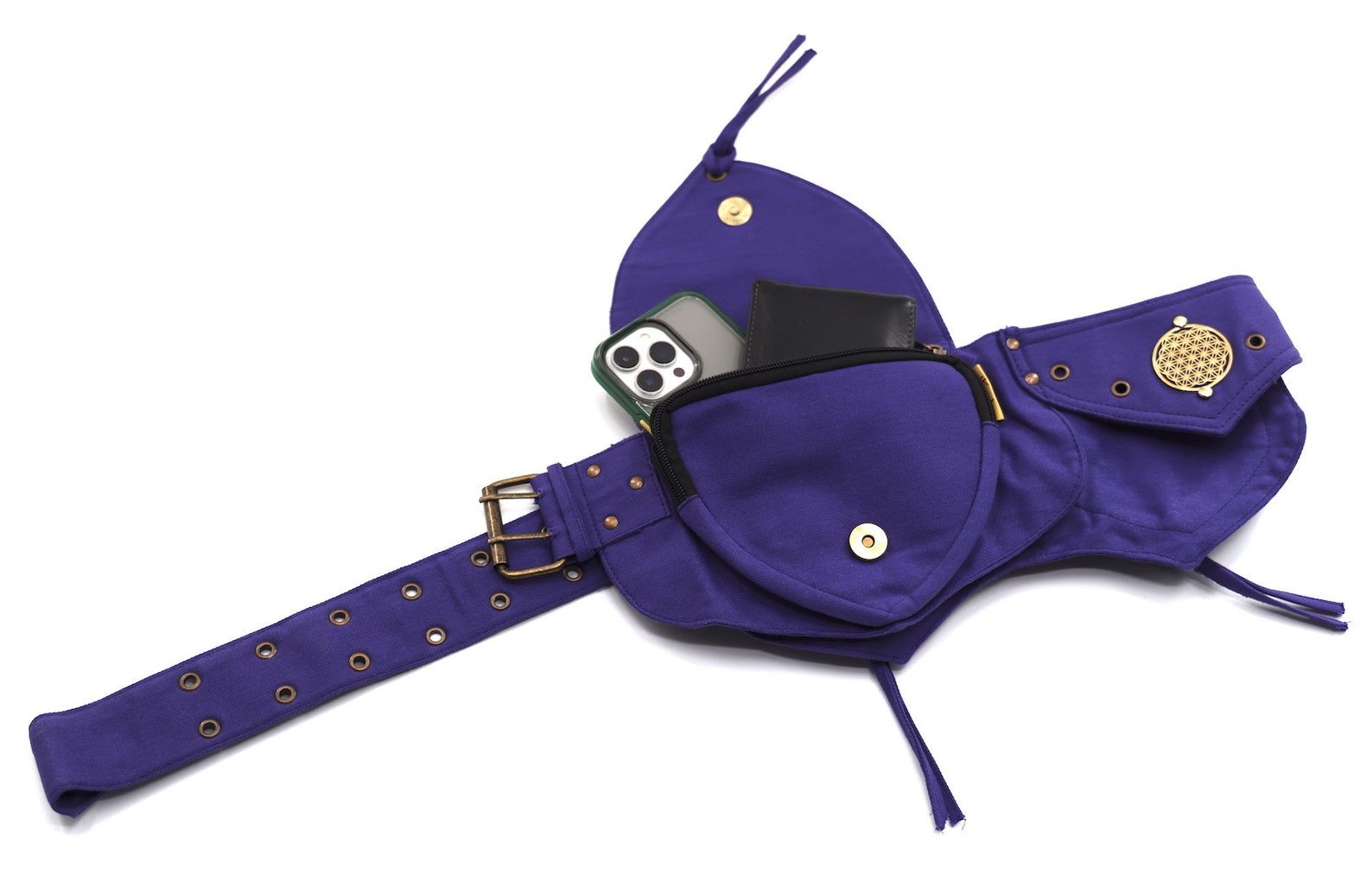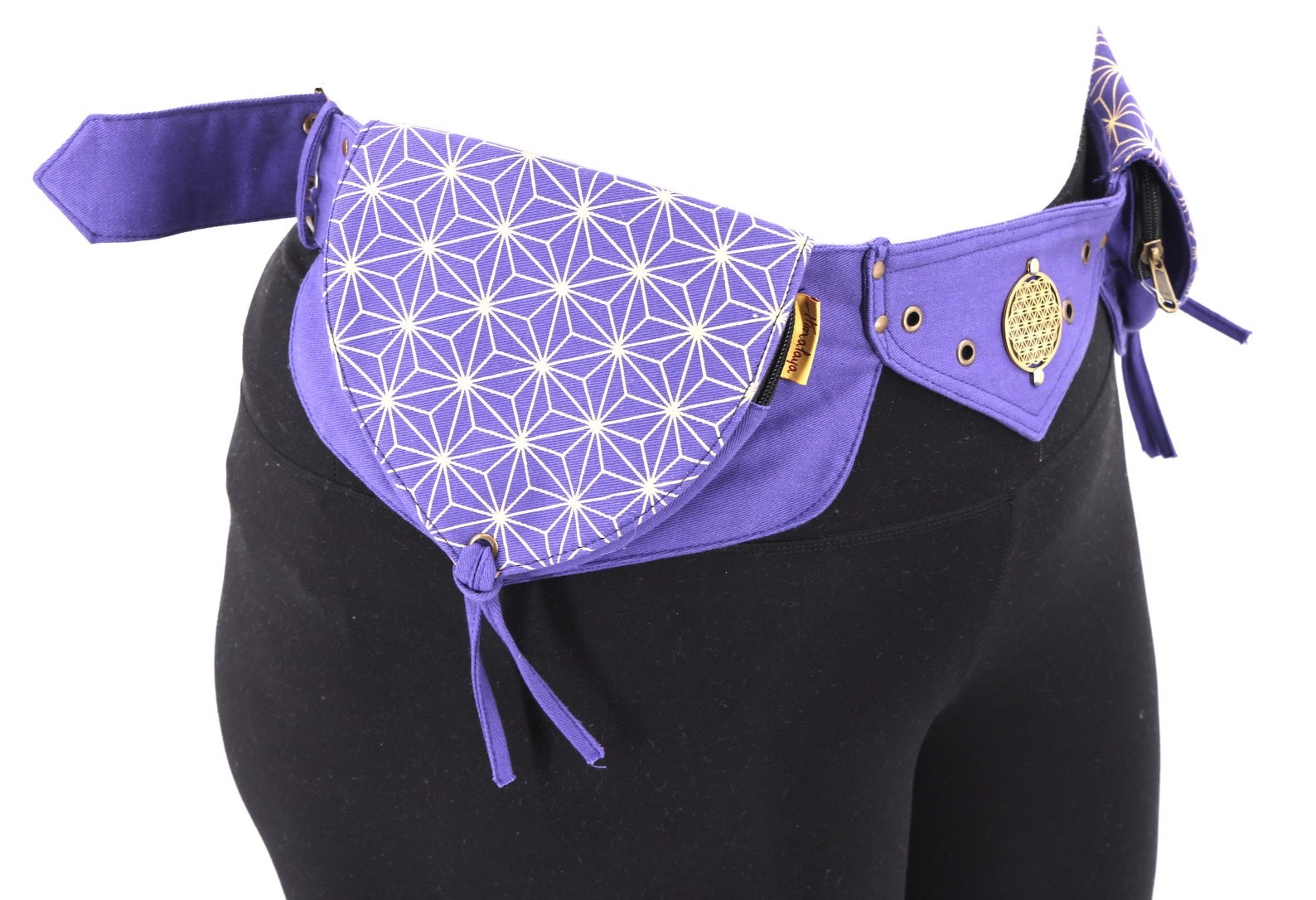 100% pure Canvas Cotton Flower of Life money belt handmade in India. This product can be used by women west or can be worn lower on the hips. This bag has charming features, it has beautiful print of the flower of life, it is practical and versatile because it can be used as a belt bag, fanny pack as well as a shoulder bag, it has 3 pockets in the front with zippers and additionally all three pocket has a magnetic button, 1 pocket is hidden on the back side, the belt is adjustable from 29 - 40 inches which can be made shorter and longer to your needs. This is a Fair-Trade product.