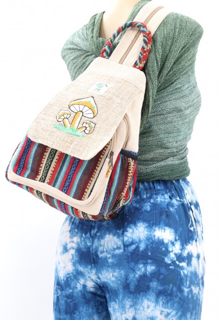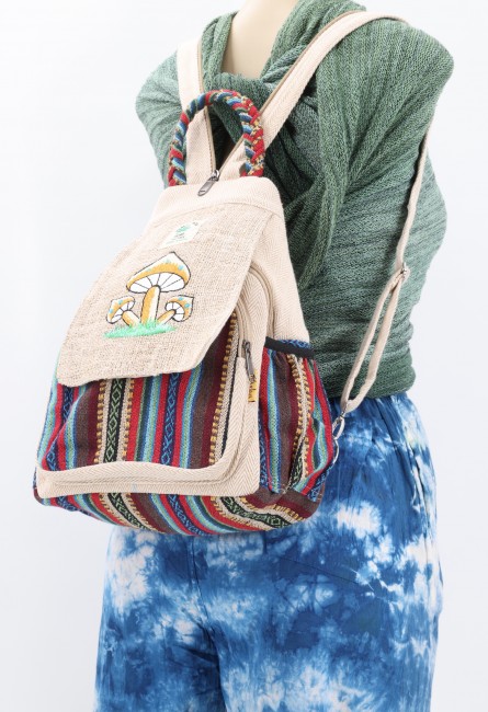 - At Himalaya Handmade we are known for creating the modern Mini hemp backpacks that are now available in a vast array of design and colors. Our Mini backpack with multicolor Aztec pattern which is made from eco-friendly natural hand-woven hemp and cotton fabric which is beautifully handcrafted in Nepal, they are of high quality and our backpacks have everything that you will need. You will not find products of higher quality anywhere else. All of our bags are sourced from the mountainous regions of Nepal and are all 100% Handmade. This backpack features are it has a unique multi colored pocket. Handcrafted this uniquely versatile Backpack comes with 2 pockets on the front both zippered and secured with a Velcro, the larger front pocket also has a zippered anti-theft pocket as well as compartment that can be used to store objects as large as 12 inches, There is also a secret back pocket which is zippered and can be used to contains various items, the bag also comes equipped with 2 water bottle holders. The bag has extremely strong construction, it has strong original two metal zippers on main compartment, soft padded straps and made from 100% Hemp, the entire bag is extremely strong but also breathable. Color of these bag will not be exact because arrangement of the pattern and the nature of these bags being handmade can cause the colors and patterns to be slightly different. Images for this bag are an overall example to what the bag looks like. Every bag is handmade and therefore unique