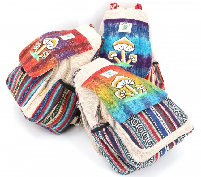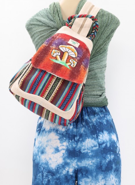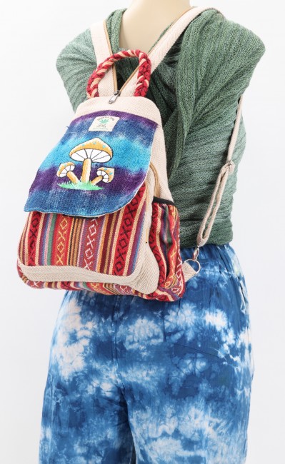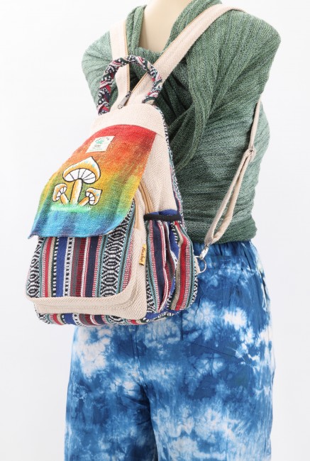 - At Himalaya Handmade we are known for creating the modern Mini hemp backpacks that are now available in a vast array of design and colors. Our Mini backpack with multicolor Aztec pattern which is made from eco-friendly natural hand-woven hemp and cotton fabric which is beautifully handcrafted in Nepal, they are of high quality and our backpacks have everything that you will need. You will not find products of higher quality anywhere else. All of our bags are sourced from the mountainous regions of Nepal and are all 100% Handmade. This backpack features are it has a unique multi colored pocket. Handcrafted this uniquely versatile Backpack comes with 2 pockets on the front both zippered and secured with a Velcro, the larger front pocket also has a zippered anti-theft pocket as well as compartment that can be used to store objects as large as 12 inches, There is also a secret back pocket which is zippered and can be used to contains various items, the bag also comes equipped with 2 water bottle holders. The bag has extremely strong construction, it has strong original two metal zippers on main compartment, soft padded straps and made from 100% Hemp, the entire bag is extremely strong but also breathable. Color of these bag will not be exact because arrangement of the pattern and the nature of these bags being handmade can cause the colors and patterns to be slightly different. Images for this bag are an overall example to what the bag looks like. Every bag is handmade and therefore unique.