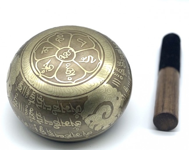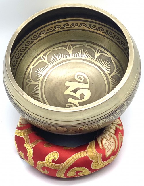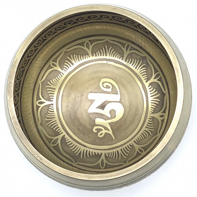 Buddhist Tibetan Om engraved in the center, surrounded by Buddhist themed engraving on the inside and the Buddhist Chant outside