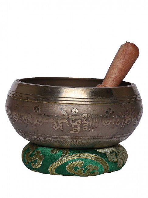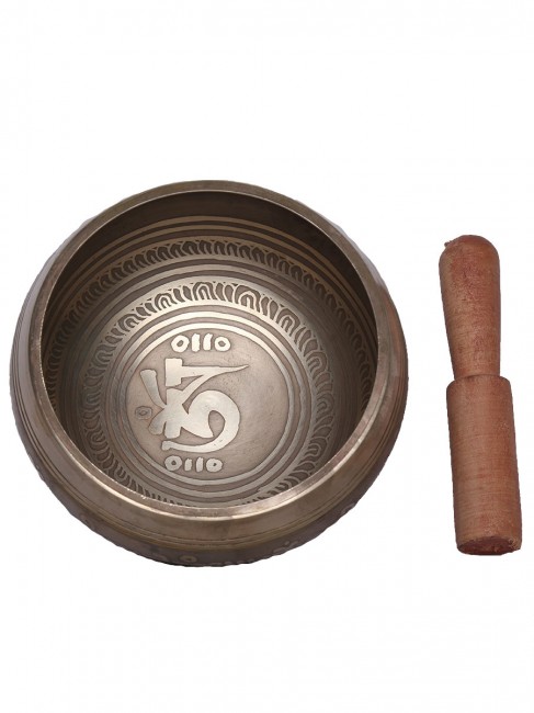 A beautiful authentic machine made singing bowl inscribed with spiritual Tibetan prayers script on the outer wall and it has an enchanting spiritual Tibetan letter design on the outside bottom. In the inner bottom it has a abstract Tibetan Om design etched on. It is made from the combination of seven different metals such as iron, mercury, copper, tin, lead, gold and silver. It gives out a melodious tone when played. The singing bowl creates a relaxing and harmonious sound which is used for yoga, music therapy, to clean the atmosphere around us and sound healing. It comes with free wooden Mallet and Silk cushion.
