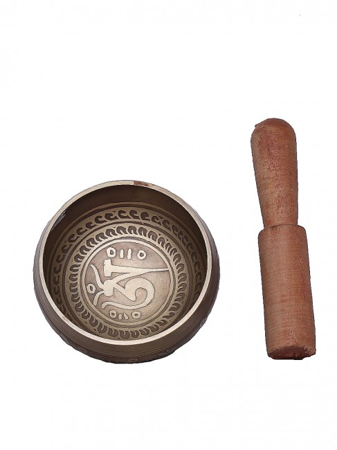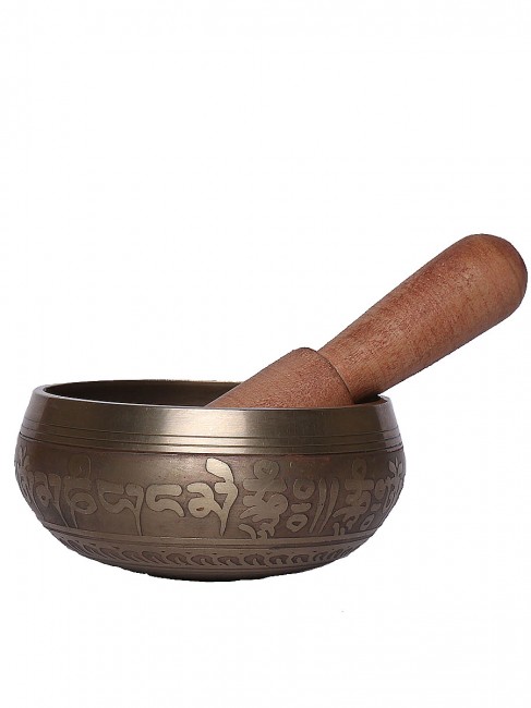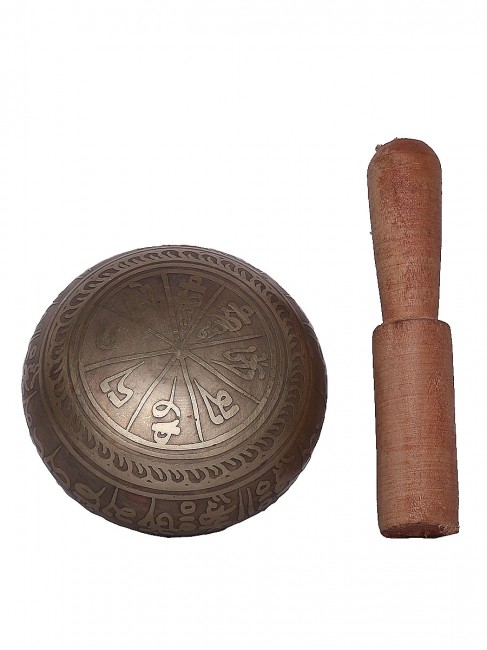 A beautiful authentic machine made singing bowl inscribed with spiritual Tibetan prayers script on the outer wall and it has an enchanting symbolic Tibetan letter design on the outside bottom. In the inner bottom it has an embossed Om design etched on. It is made from the combination of seven different metals such as iron, mercury, copper, tin, lead, gold and silver. It gives out a melodious tone when played. The singing bowl creates a relaxing and harmonious sound which is used for yoga, music therapy, to clean the atmosphere around us and sound healing. It comes with free wooden Mallet and Silk cushion.