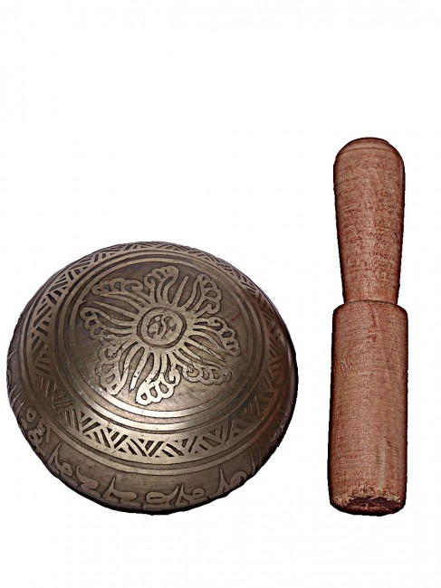 A beautiful authentic machine made singing bowl inscribed with spiritual Tibetan prayers script on the outer wall and it has a abstract Buddha eyes design on the outside bottom. In the inner bottom it has an enchanting symbolic spiritual Tibetan letter etched on. It is made from the combination of seven different metals such as iron, mercury, copper, tin, lead, gold and silver. It gives out a melodious tone when played. The singing bowl creates a relaxing and harmonious sound which is used for yoga, music therapy, to clean the atmosphere around us and sound healing. It comes with free wooden Mallet and Silk cushion.