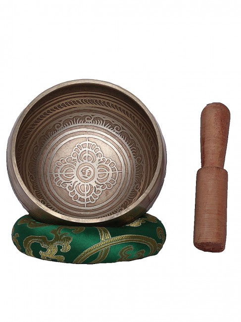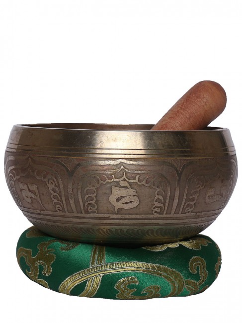 A beautiful authentic machine made singing bowl inscribed with big symbolic spiritual Tibetan letters on the outer wall with other intricate design and it has an enchanting Tibetan letter Om design on the outside bottom. In the inner bottom it has an embossed Bajra design etched on. It is made from the combination of seven different metals such as iron, mercury, copper, tin, lead, gold and silver. It gives out a melodious tone when played. The singing bowl creates a relaxing and harmonious sound which is used for yoga, music therapy, to clean the atmosphere around us and sound healing. It comes with free wooden Mallet and Silk cushion.