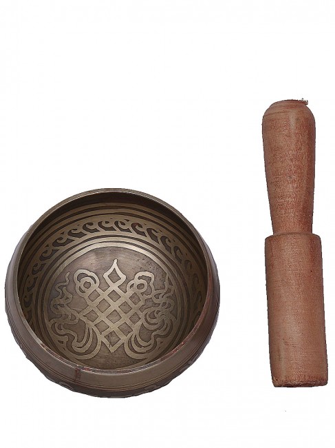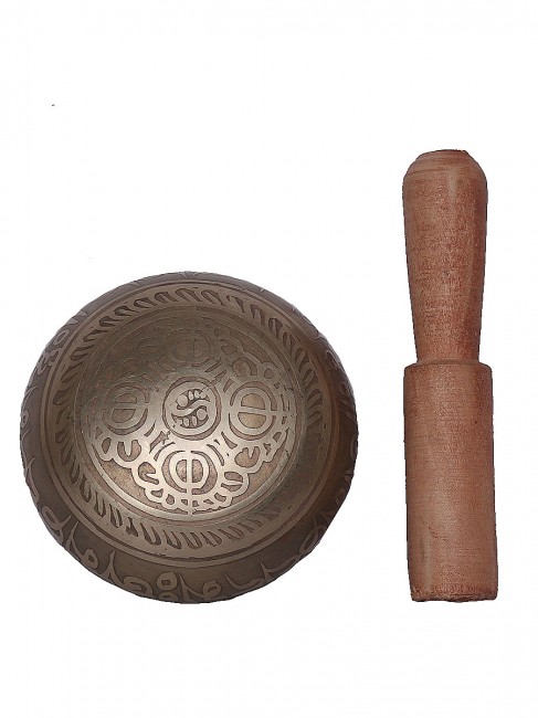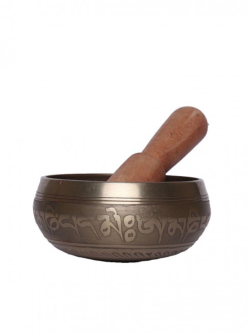 A beautiful authentic machine made singing bowl inscribed with spiritual Tibetan prayers script on the outer wall and it has an embossed Bajra design on the outside bottom. In the inner bottom it has an enchanting Tibetan Ashtamangala design etched on. It is made from the combination of seven different metals such as iron, mercury, copper, tin, lead, gold and silver. It gives out a melodious tone when played. The singing bowl creates a relaxing and harmonious sound which is used for yoga, music therapy, to clean the atmosphere around us and sound healing. It comes with free wooden Mallet and Silk cushion.