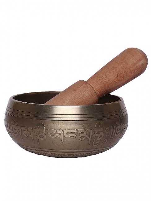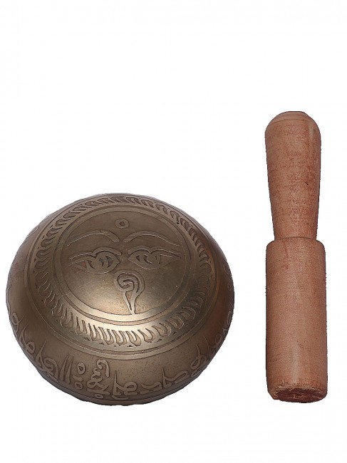 A beautiful authentic machine made singing bowl inscribed with spiritual Tibetan prayers script on the outer wall and it has an embossed Buddha eyes design on the outside bottom. In the inner bottom it has an enchanting symbolic Tibetan letter design etched on. It is made from the combination of seven different metals such as iron, mercury, copper, tin, lead, gold and silver. It gives out a melodious tone when played. The singing bowl creates a relaxing and harmonious sound which is used for yoga, music therapy, to clean the atmosphere around us and sound healing. It comes with free wooden Mallet and Silk cushion.