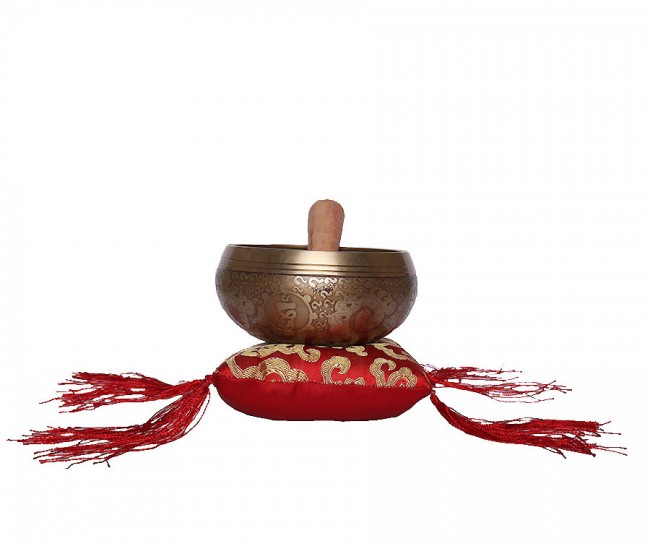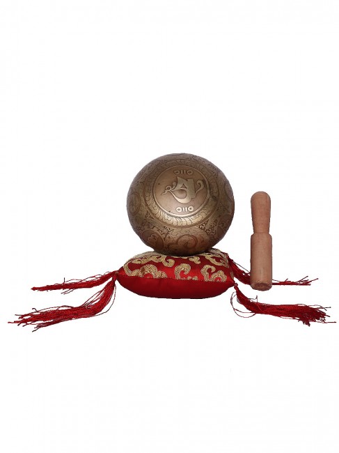 A beautiful authentic machine made singing bowl inscribed with big symbolic spiritual Tibetan letters on the outer wall with other intricate design and it has an embossed Tibetan letter Om on the outside bottom. The inner bottom has enchanting spiritual Tibetan Ashtamangala design etched on. It is made from the combination of seven different metals such as iron, mercury, copper, tin, lead, gold and silver. The singing bowl creates a relaxing and harmonious sound which is used for yoga, music therapy, to clean the atmosphere around us and sound healing. It comes with free wooden Mallet and Silk cushion.