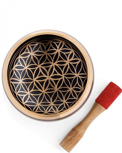 A beautiful authentic machine made dark brown varnished singing bowl inscribed with spiritual Tibetan prayers script on the outer wall and it has abstract Buddha eyes on the outside bottom. In the inner bottom it has an enchanting spiritual Tibetan letter design etched on. It is made from the combination of seven different metals such as iron, mercury, copper, tin, lead, gold and silver. It gives out a melodious tone when played. The singing bowl creates a relaxing and harmonious sound which is used for yoga, music therapy, to clean the atmosphere around us and sound healing. It comes with free wooden Mallet and Silk cushion.