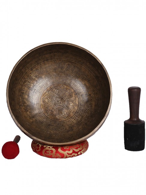 A beautiful inscribed hand crafted singing bowl with an embossed intricate design around the outer wall and it has an enchanting Tibetan design on the outside bottom. The inner bottom has intricate design with symbolic Tibetan letter etched on. It is made from the combination of seven different metals. The singing bowl produces a relaxing and harmonious sound which is used for yoga, music therapy, to clean the atmosphere around us, religious ceremonies and sound healing. It comes with free wooden Mallet and Silk cushion.