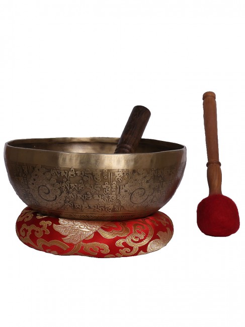 A beautiful inscribed hand crafted singing bowl with Tibetan prayer scripted symbols around the outer wall also it’s embossed with other intricate design on outside and it has abstract Bajra design on the outside bottom. The inner bottom has an enchanting Tibetan letter design etched on. It is made from the combination of seven different metals. The singing bowl produces a relaxing and harmonious sound which is used for yoga, music therapy, to clean the atmosphere around us and sound healing. It comes with free wooden Mallet and Silk cushion.