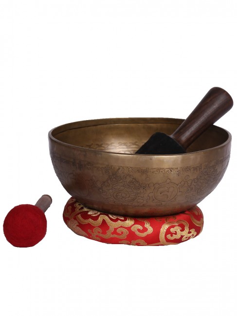 A beautiful inscribed hand crafted singing bowl with Tibetan prayer scripted symbols around the outer wall also it’s embossed with other intricate design on outside and it has abstract Om design on the outside bottom. The inner bottom has an enchanting Tibetan design etched on. It is made from the combination of seven different metals. The singing bowl produces a relaxing and harmonious sound which is used for yoga, music therapy, to clean the atmosphere around us and sound healing. It comes with free wooden Mallet and Silk cushion.
